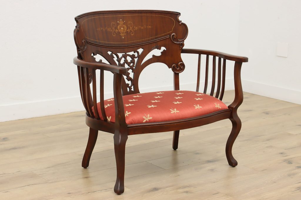 Collectors often recognize Art Nouveau furniture by its distinctive “whiplash curve,” a sweeping S-shaped line that resembles a vine or plant stem. These elegant curves appear in chair backs, cabinet doors, and carved panels throughout the period.