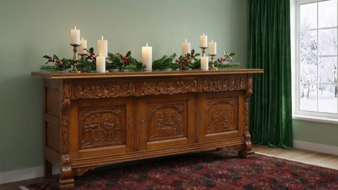 During the holidays, a well-styled sideboard becomes a focal point of beauty and practicality.