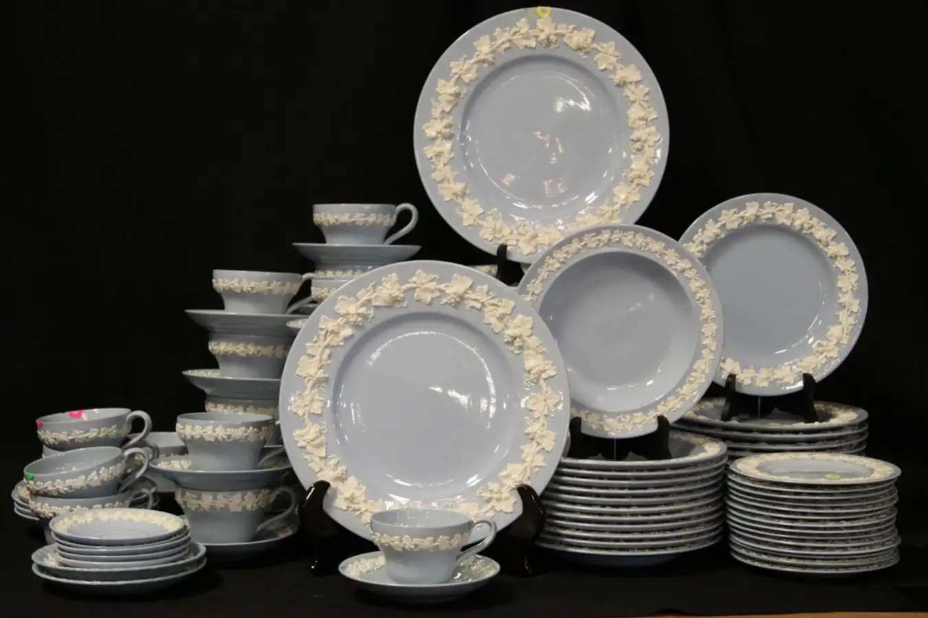 Signed Wedgwood "Barlaston" this lot of china has some wear - see photos and notation of damage.