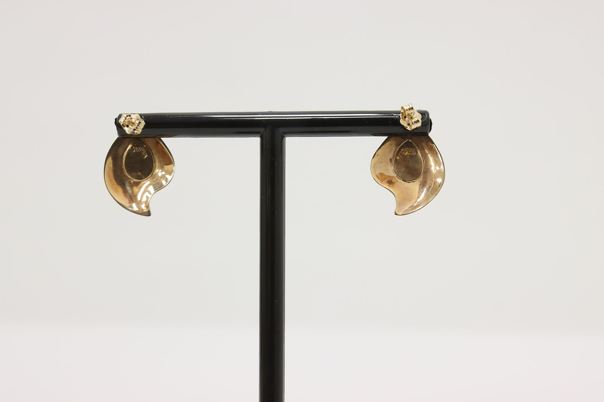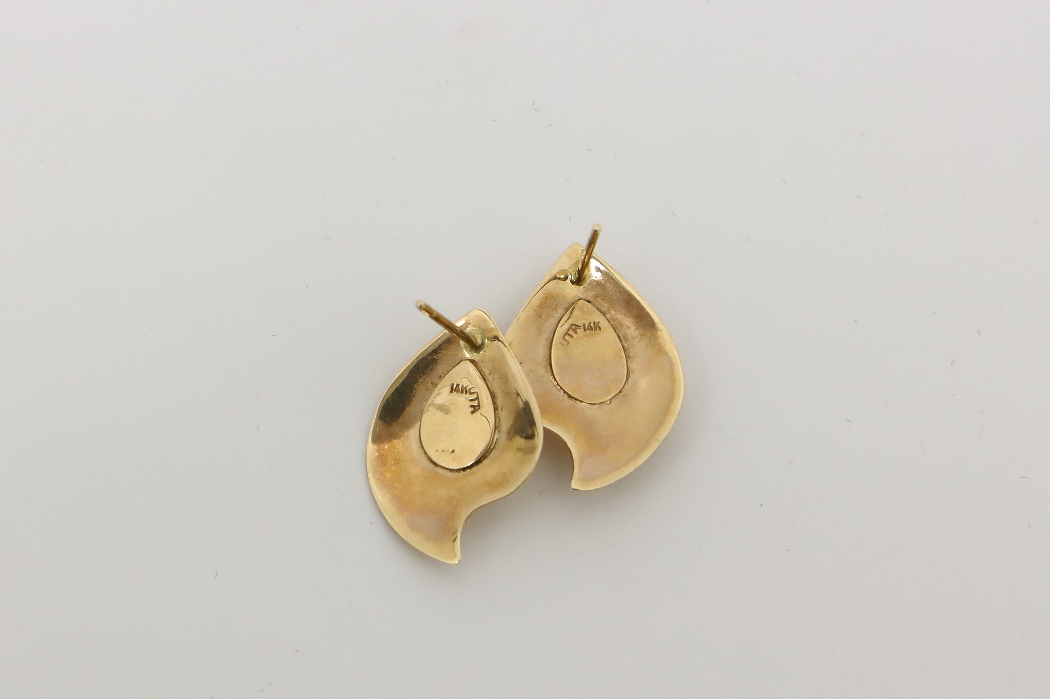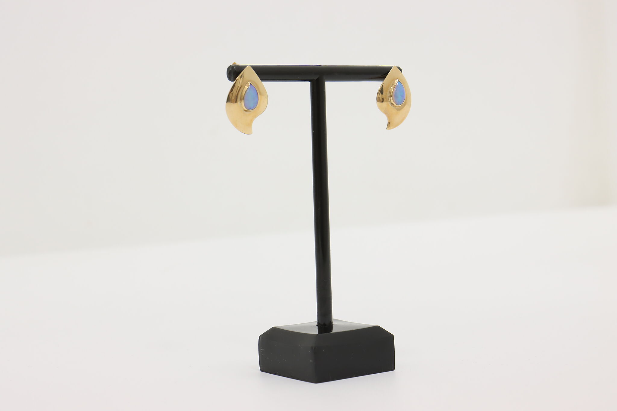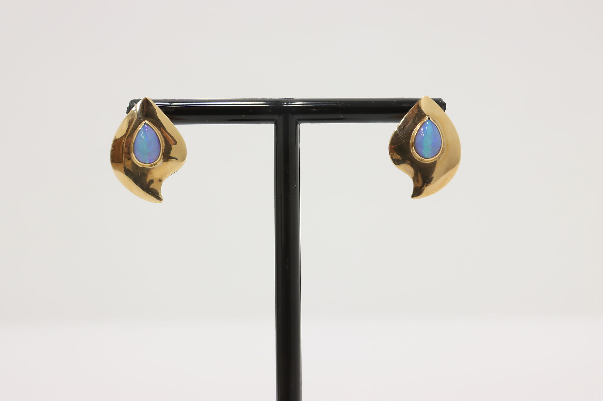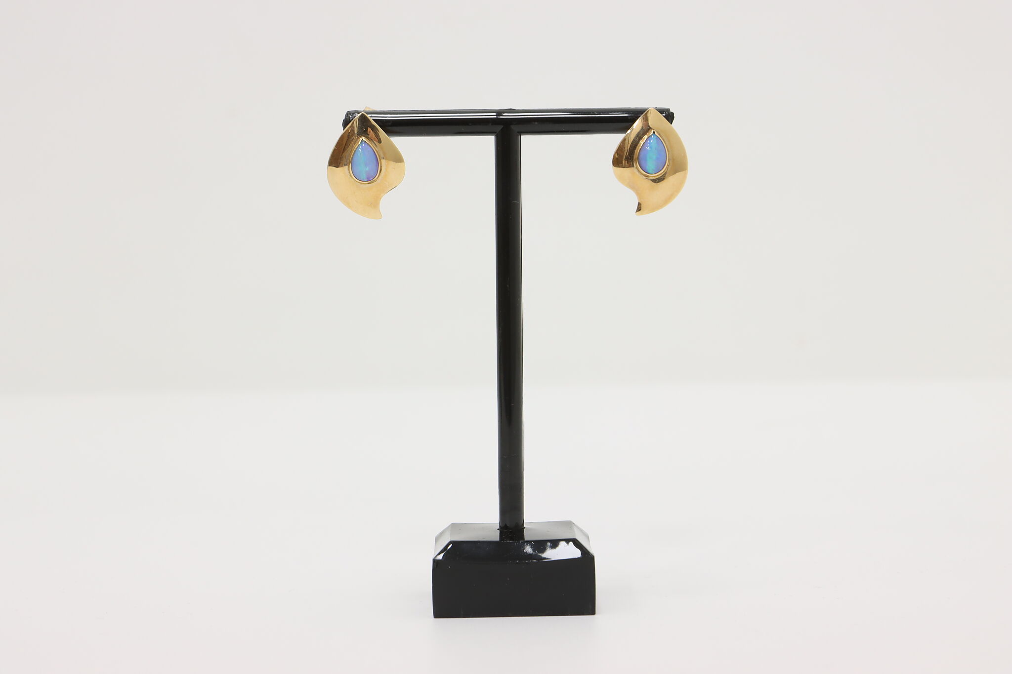 A unique pair of 14k gold earrings featuring vibrant marquise-cut opals set in sculptural modernist frames.
