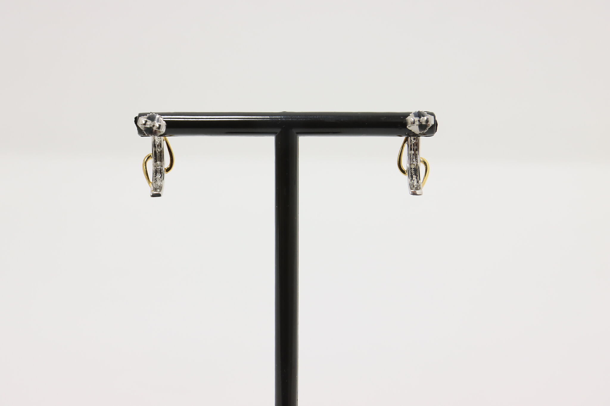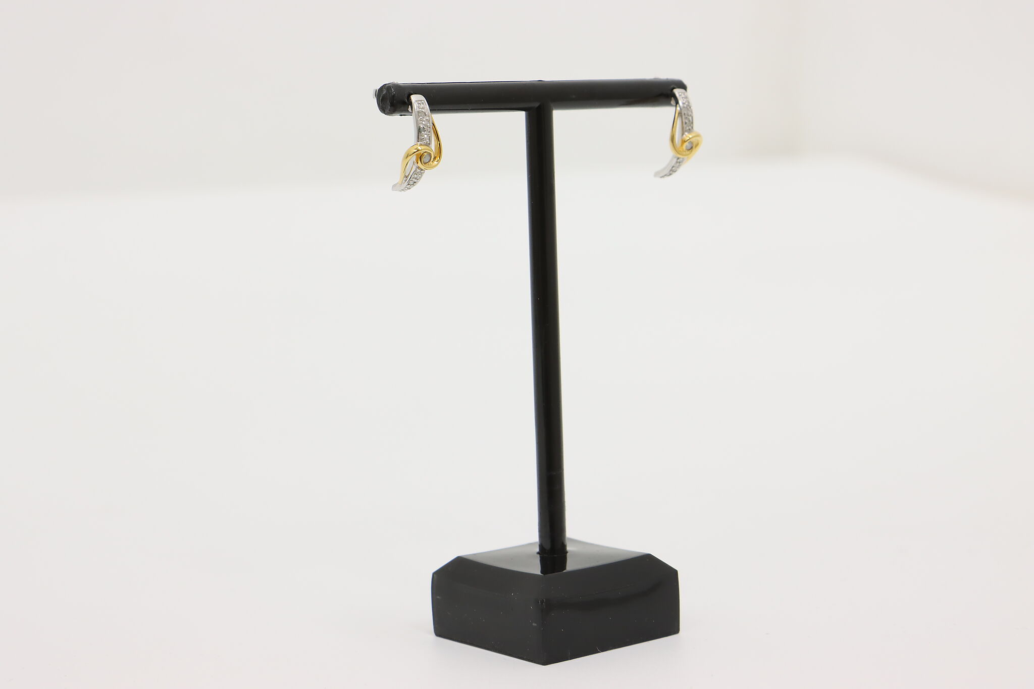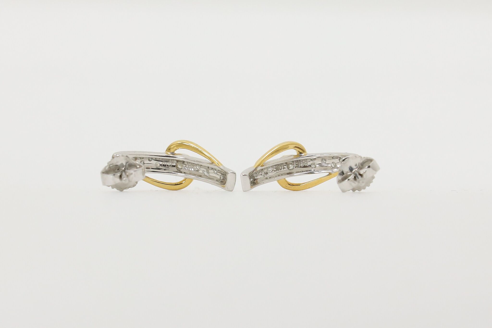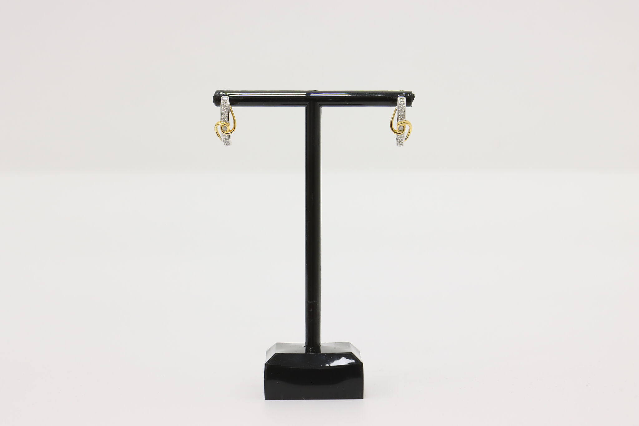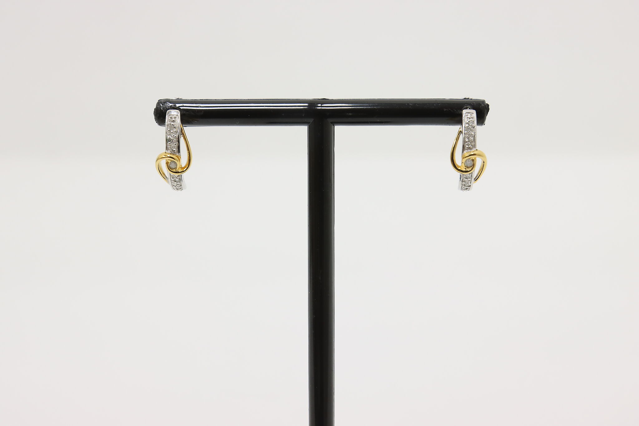 A refined pair of 14k two-tone earrings featuring a polished gold knot with diamond set white gold bars.
