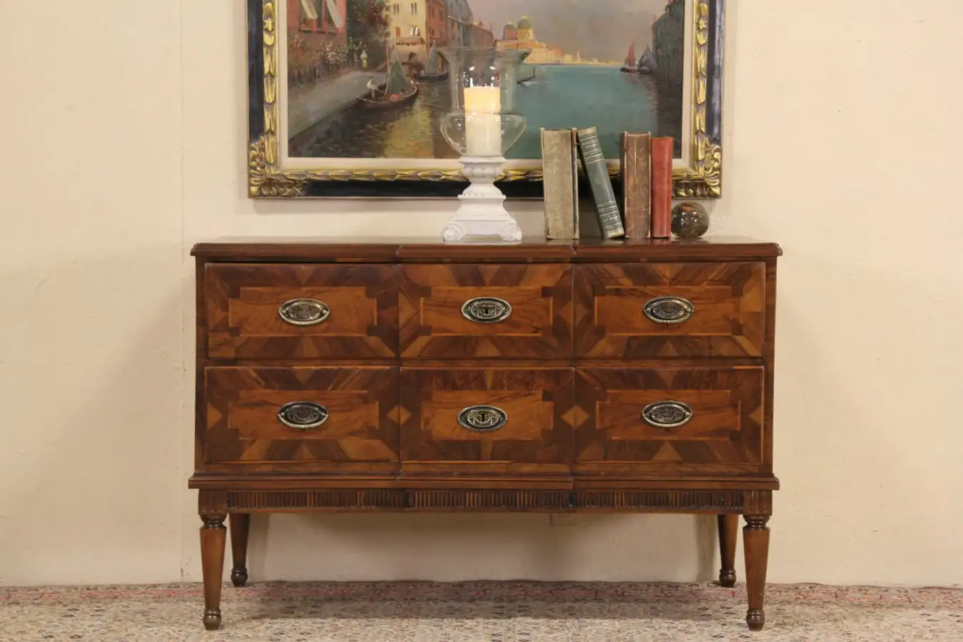 Handcrafted in Germany around 1760, this hall or linen chest or dresser is very well preserved. Walnut with inlaid satinwood and mahogany banding and burl panels, the finish is in excellent condition, preserving stains, losses and shrinkage separations for antique character.