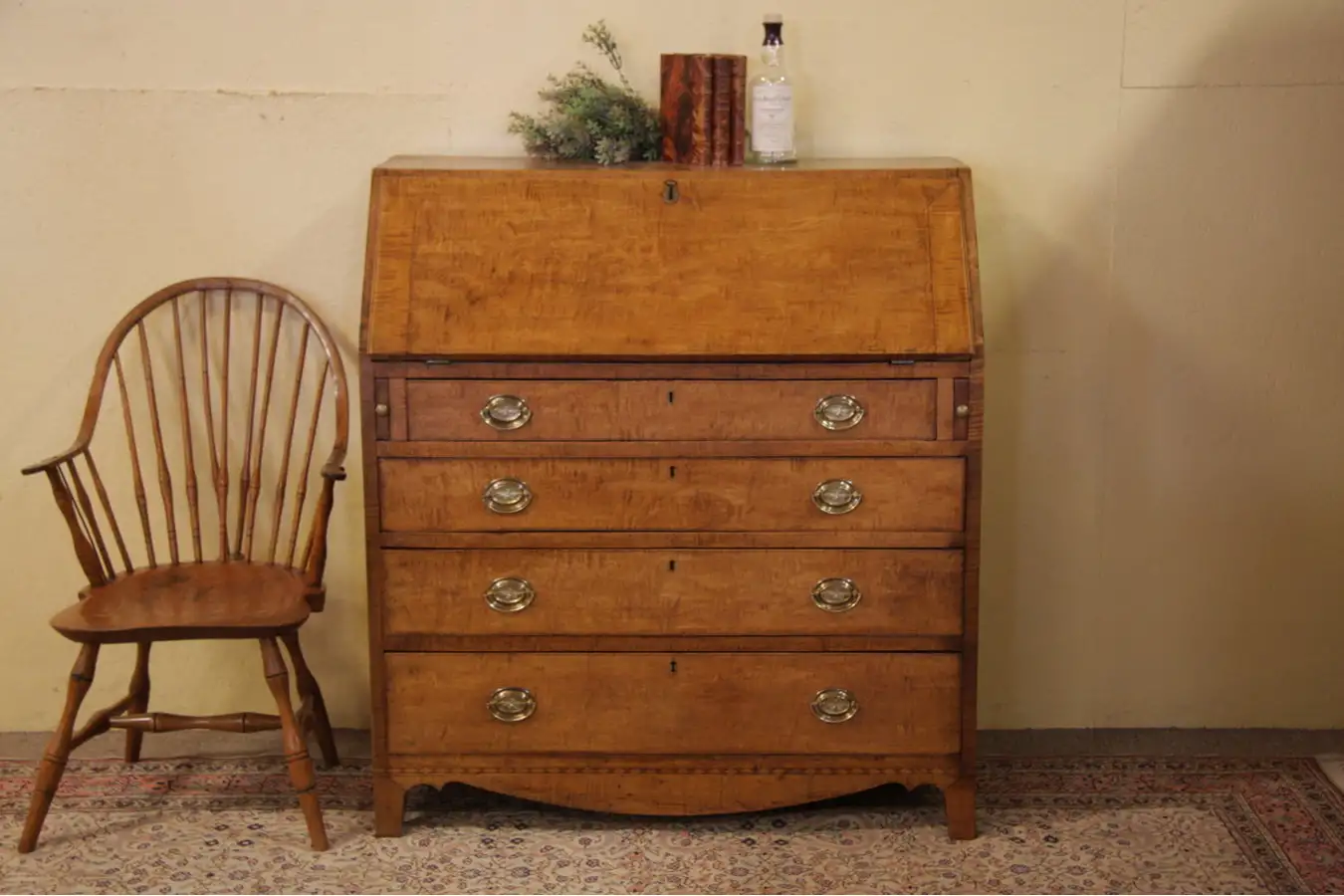 Hand made about 1790 by a skilled country carpenter, a solid tiger and curly maple Federal period secretary desk is in beautiful condition. Unpretentious but expertly crafted, the shimmering grain has wonderful patina, the golden finish is very fine with enough wear and mars for a little character.