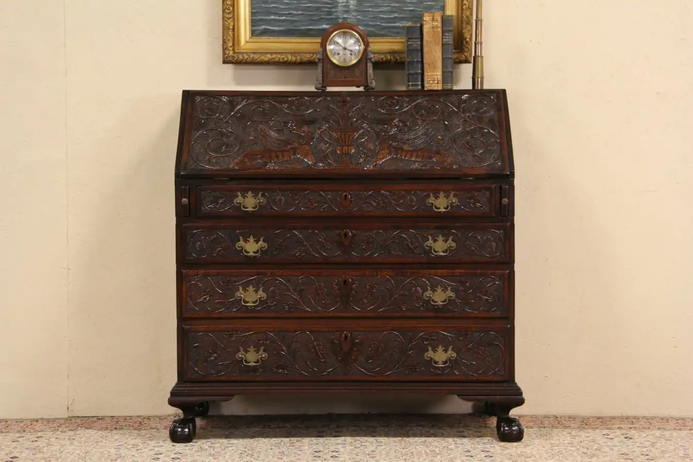 Three dimensional artistry as well as the ball and claw feet show masterful craftsmanship. Upper corners show hand made dovetail construction. The drop front rests on pull out supports, the key is a handle only as the lock does not work. Inside are drawers and cubicles, a locking compartment and "secret" drawers. Graduated drawers have hand cut dovetail joints on this historic furniture.