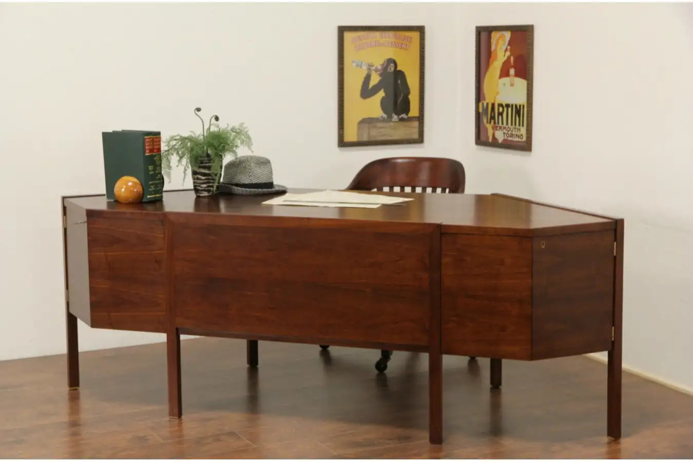 Signed by famous maker, "Dunbar," this Midcentury Modern executive desk has a striking angled shape that fits beautifully into a corner.