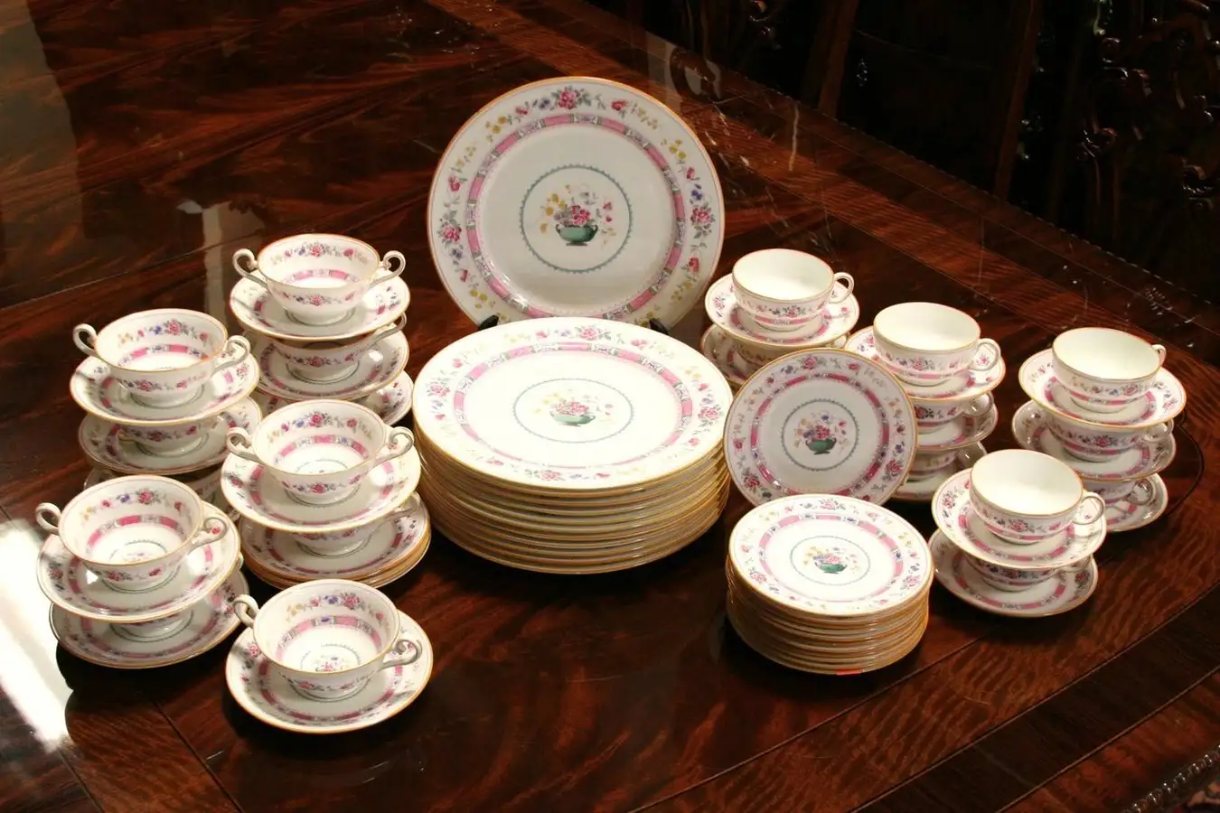 A beautiful set of famous Royal Doulton hand painted china dates from the 1920's, and each place setting includes a dinner plate, bread and butter plate, cup and sauce, 2-handled soup and underplate.
