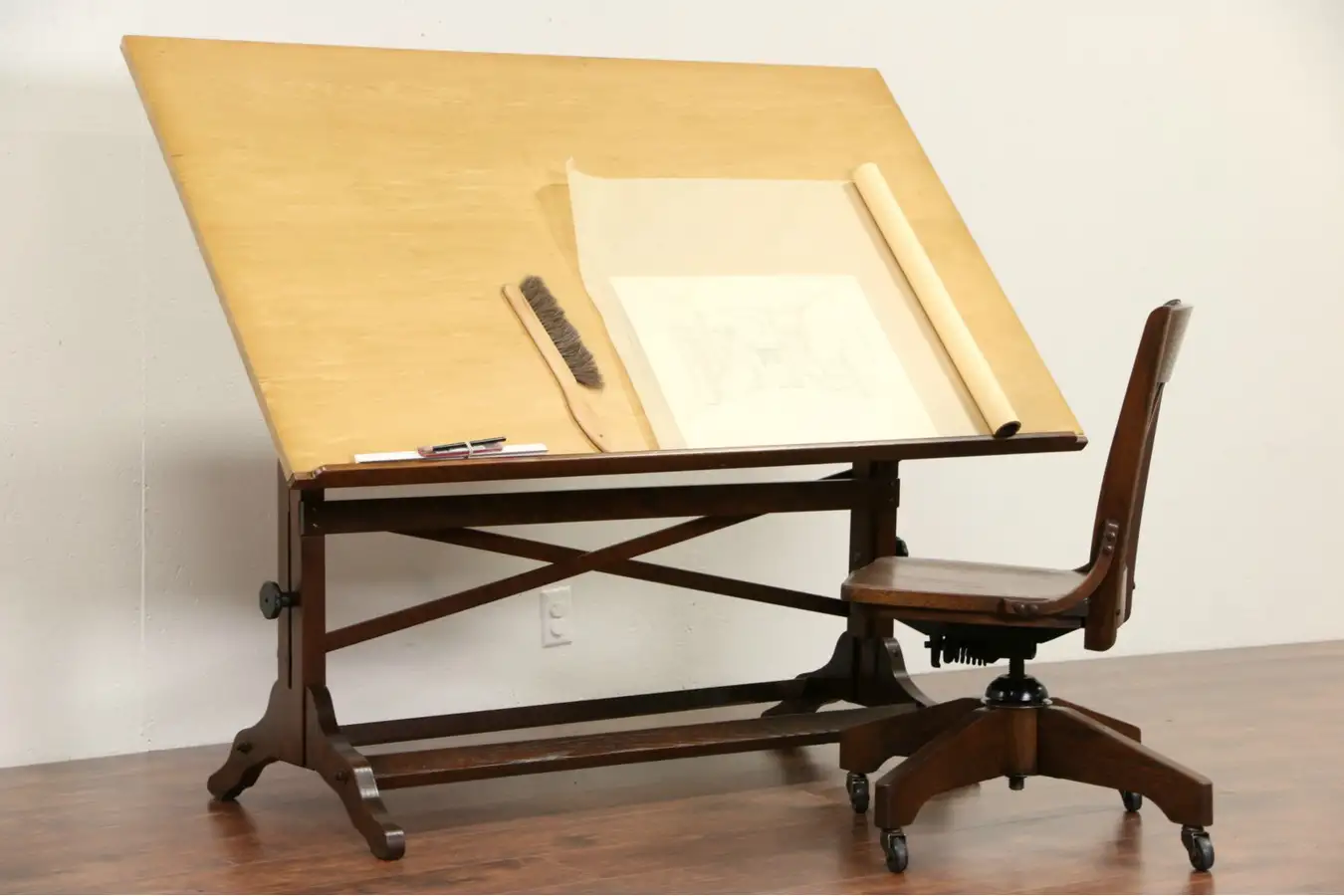 An architect's drafting, drawing or artist table is adjustable in every direction, and a collector tells us this is a Frederick Post "Norseman" model from 1944. The top is later, probably replacing one with lots of pin holes from drawings. Useful for an artist or as an adjustable wine and appetizer table, this rugged antique has industrial charm. The top is maple with a loss at the bottom right corner, see photos. Solid oak, the base is well worn at the edges and feet, see photos. The finish is in excellent condition has iron mounts and adjustment handles. American made office furniture, size of the top is 60" long and 36 1/2" deep. Height is adjustable from 33 - 42" tall when adjusted to the flat position, and can be raised to any angle. See 18 photos on Harp Gallery website that enlarge to full screen size.