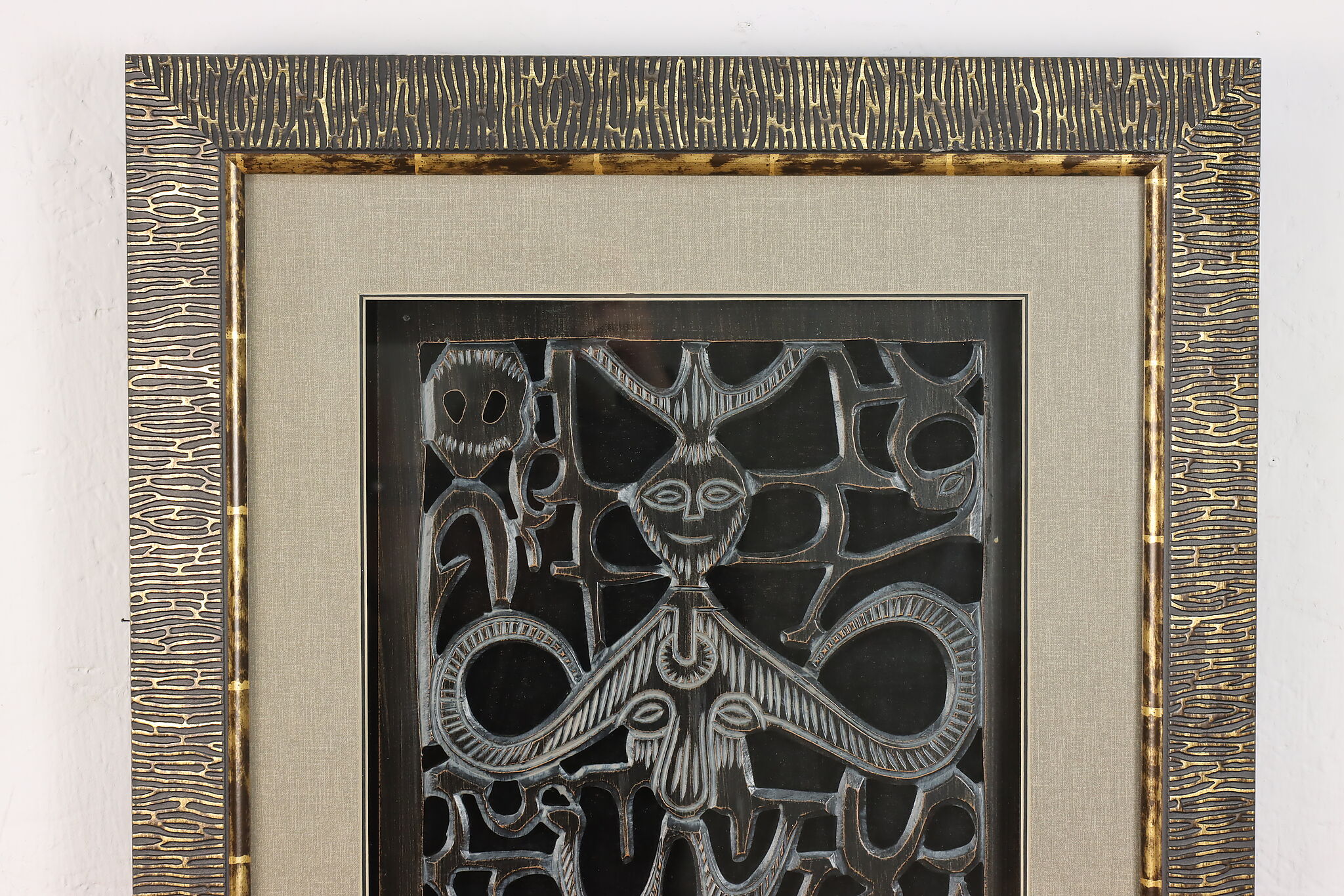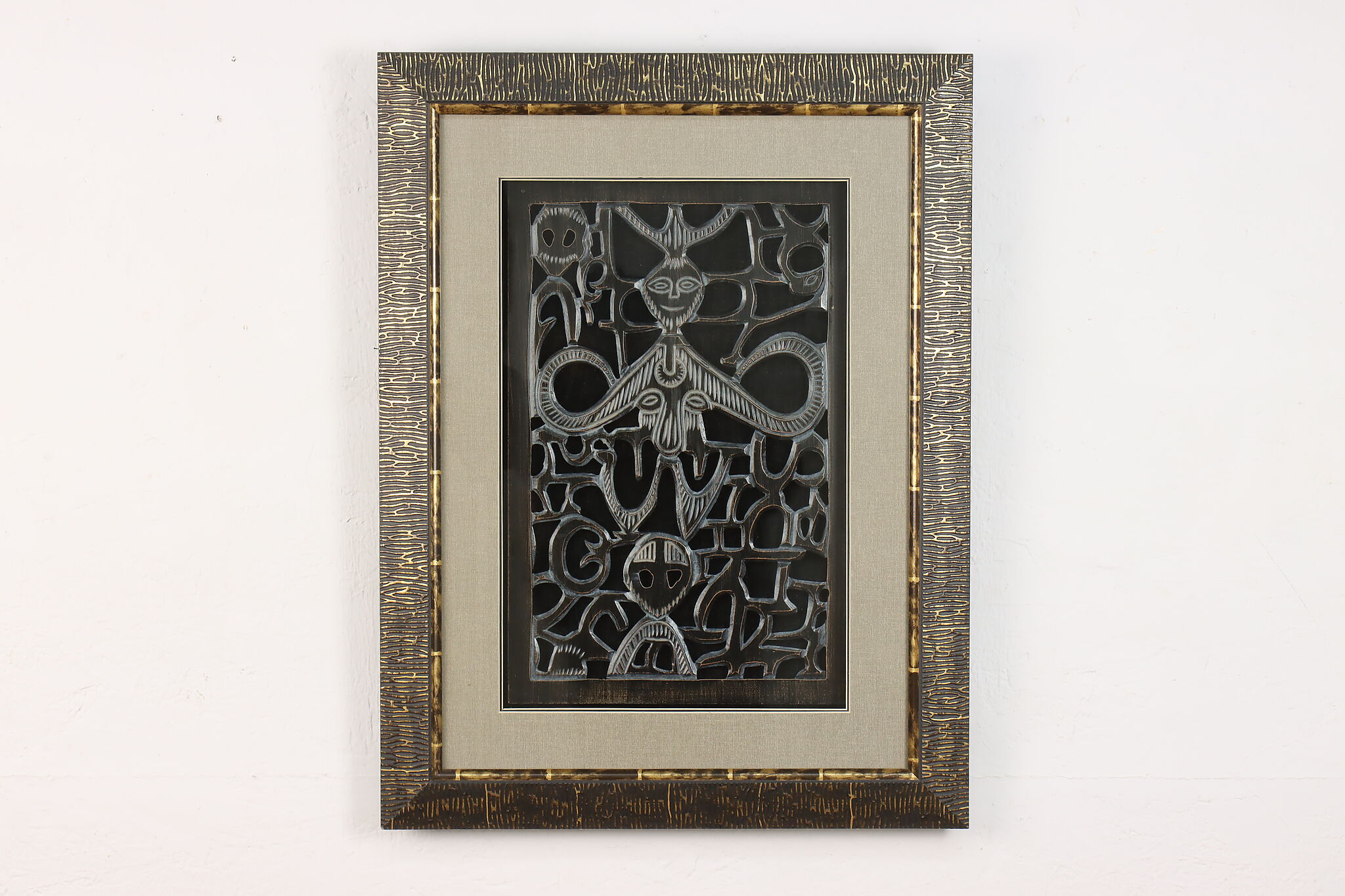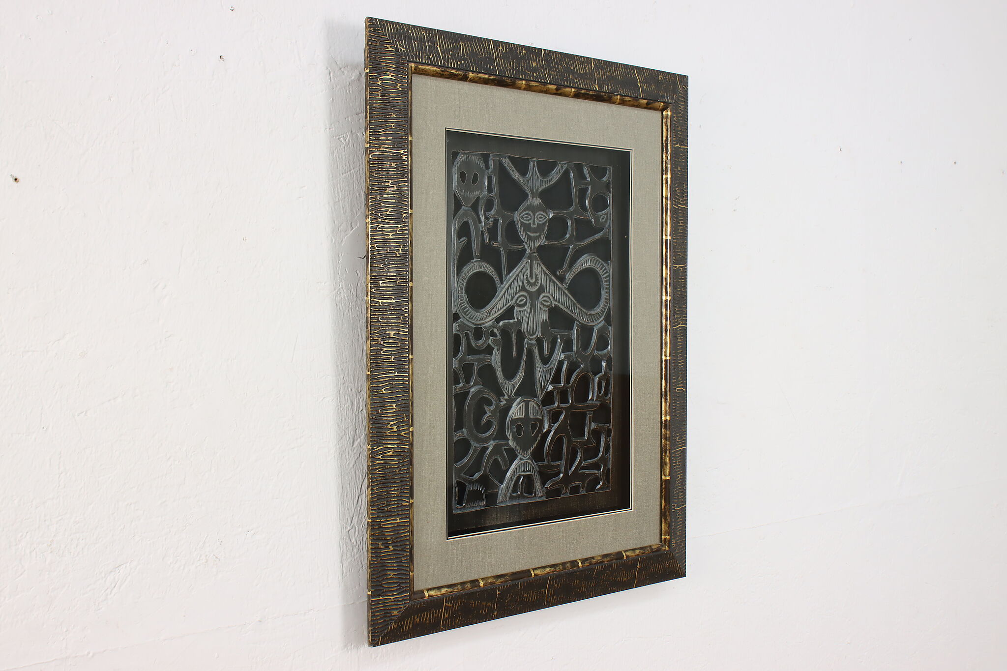 This lovely shadowbox houses a delicately hand carved wooden fragment from Africa with traditional tribal figures.
