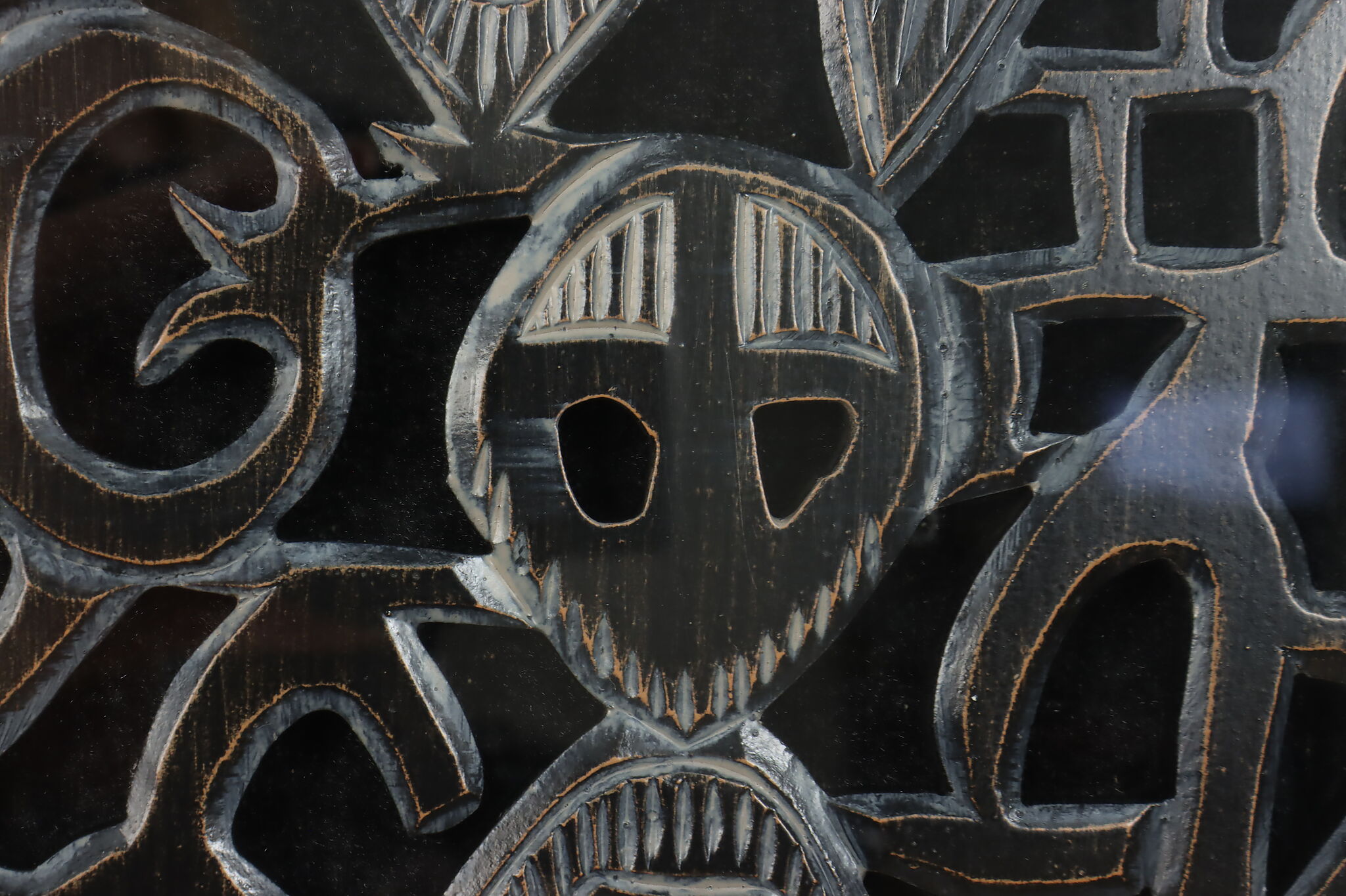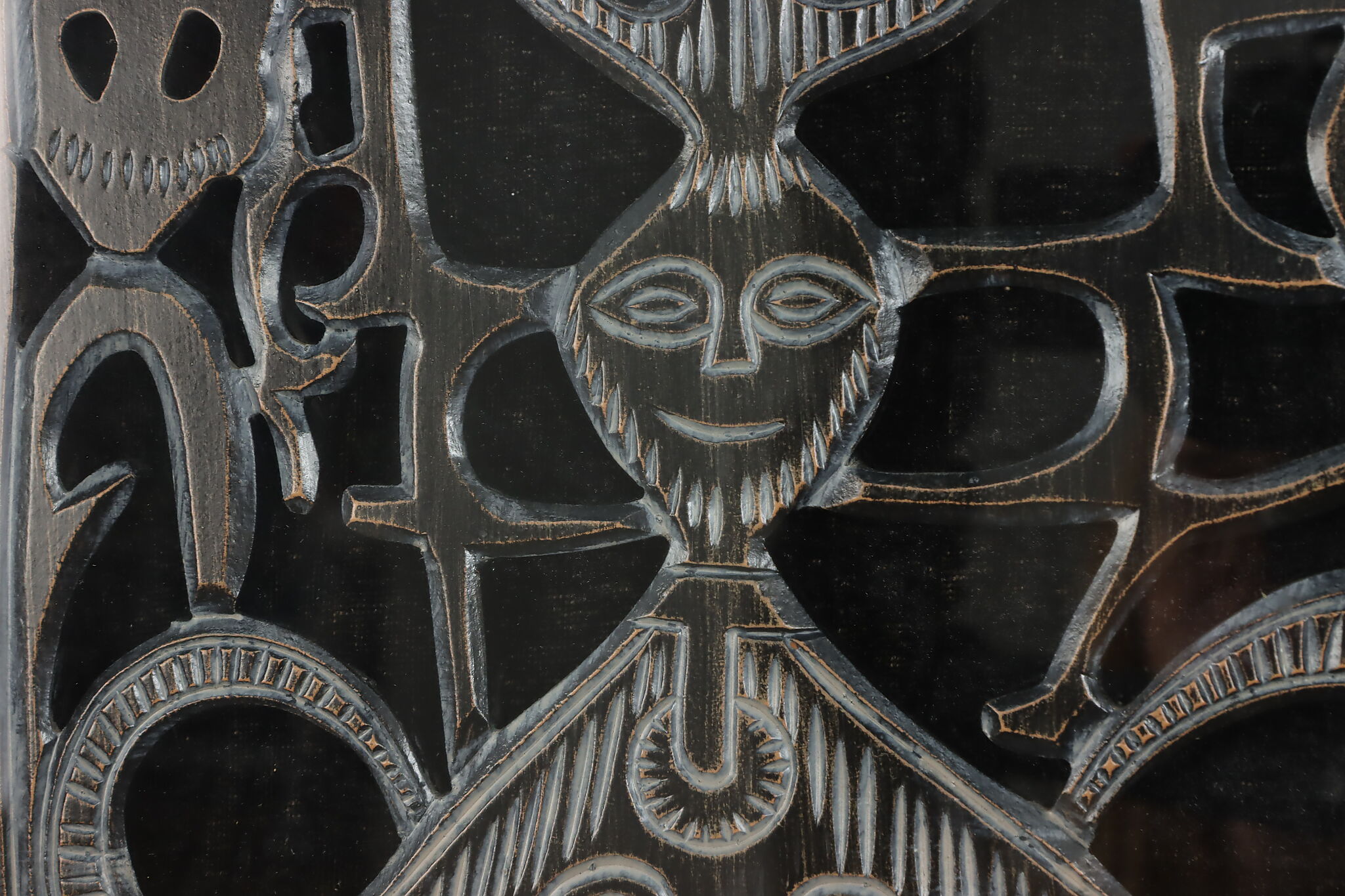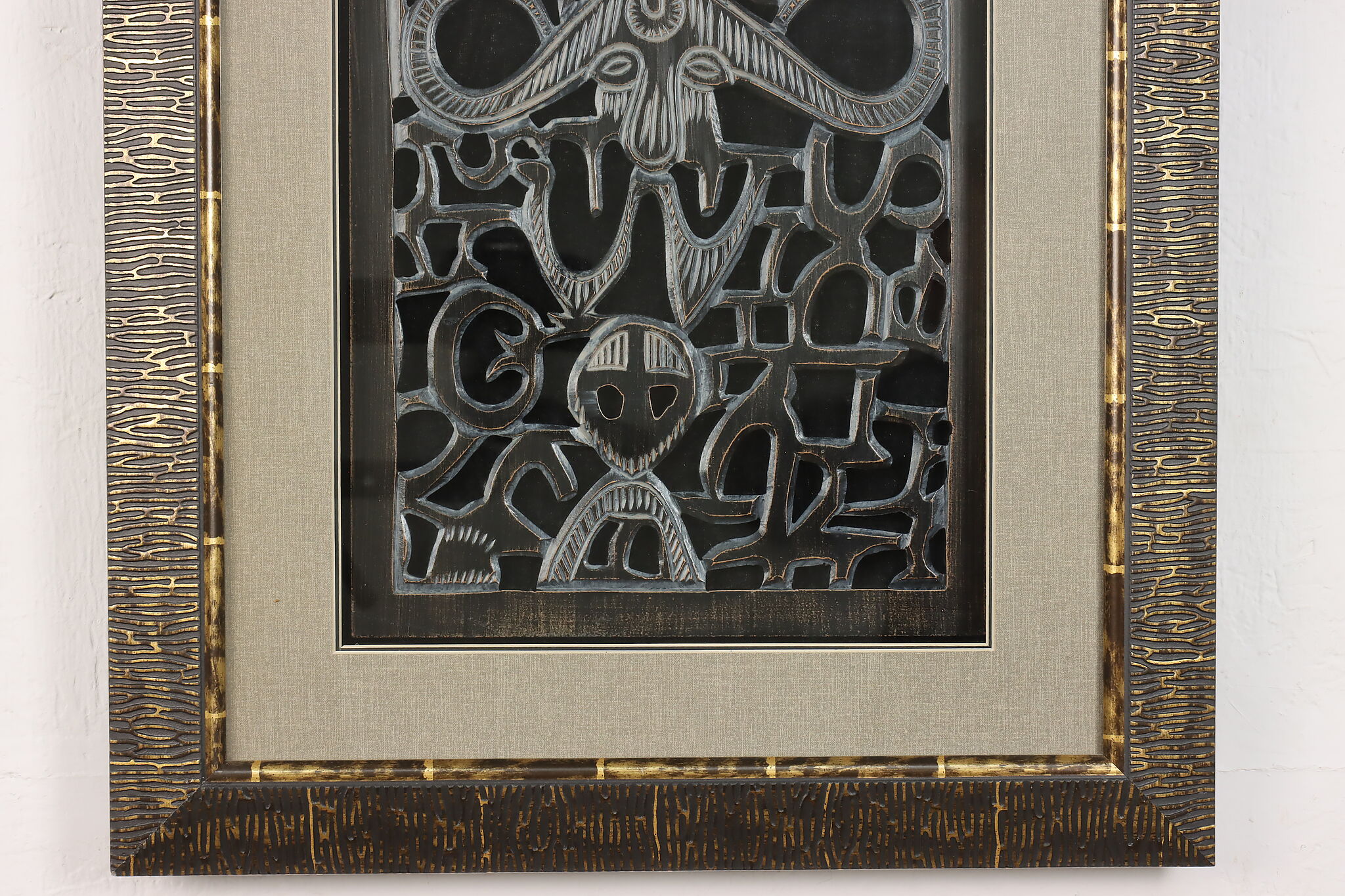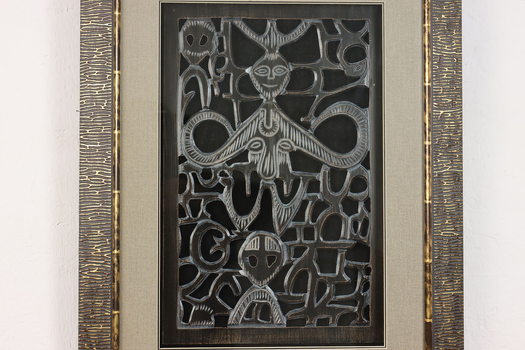 This lovely shadowbox houses a delicately hand carved wooden fragment from Africa with traditional tribal figures.