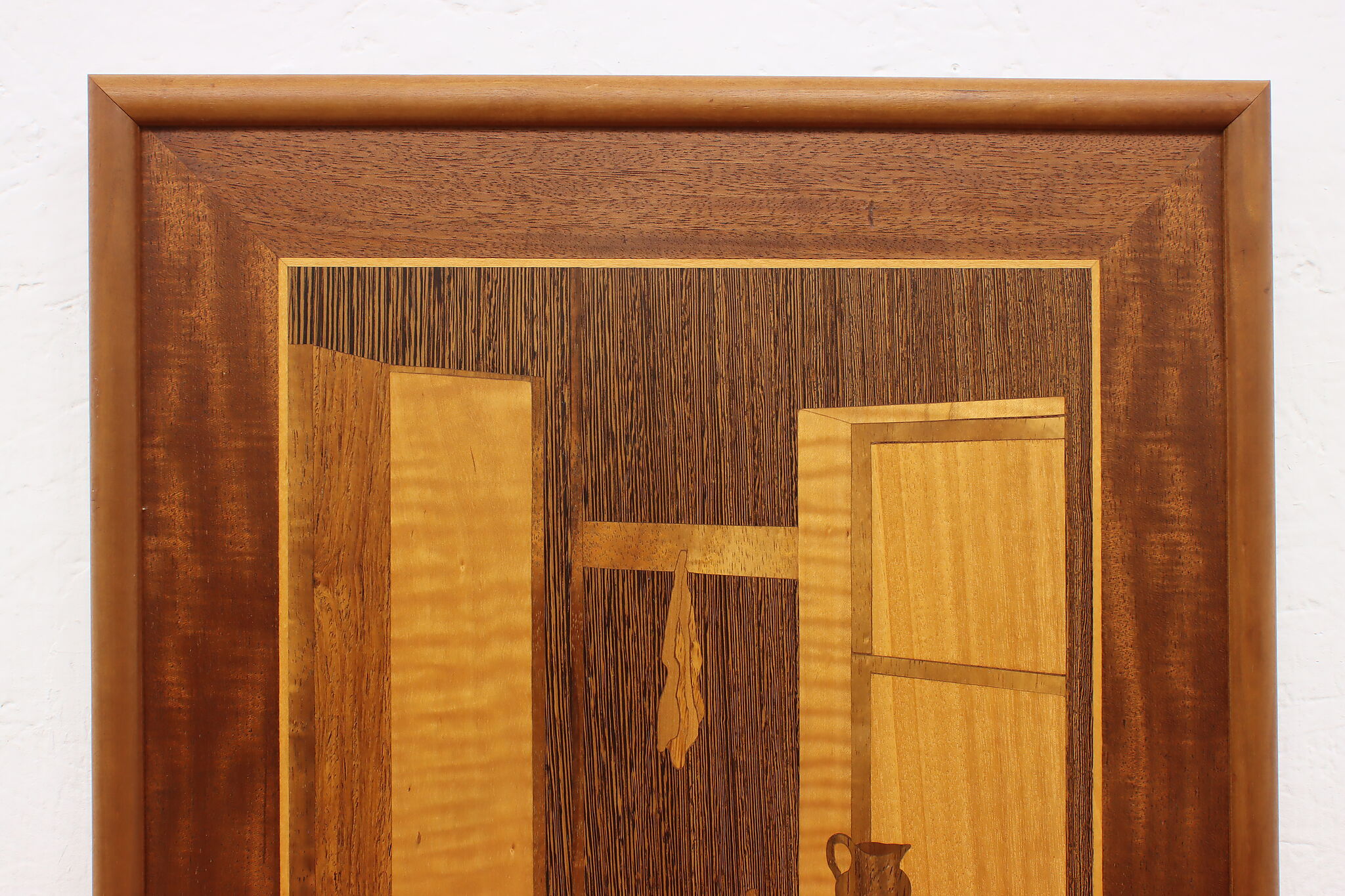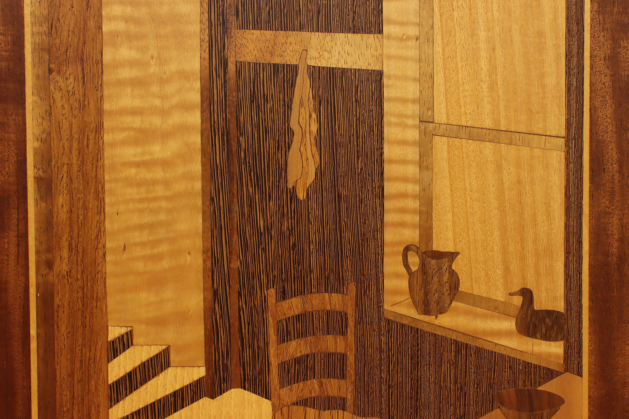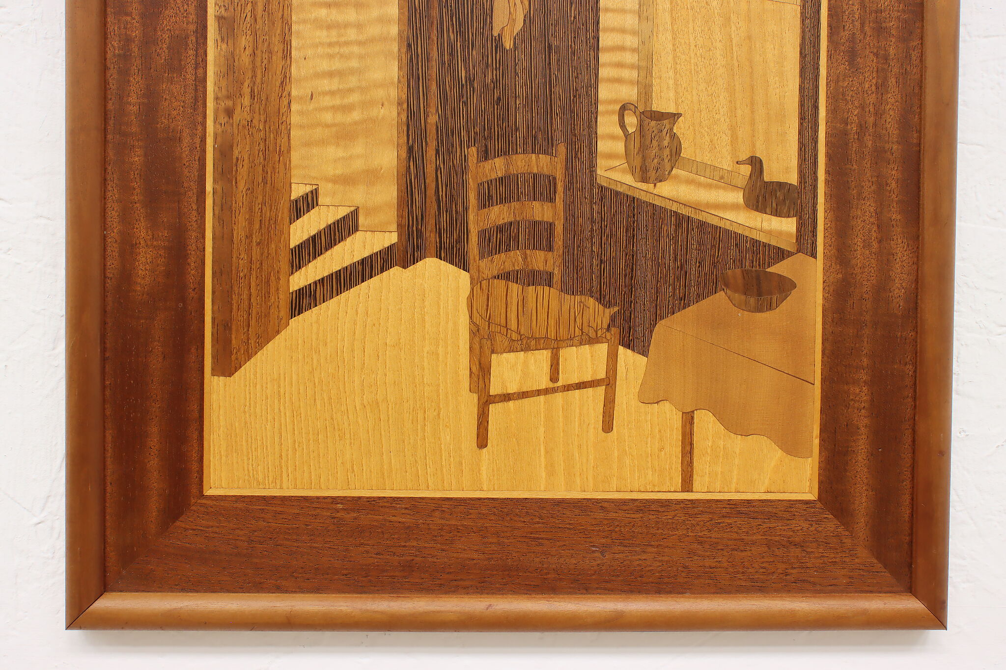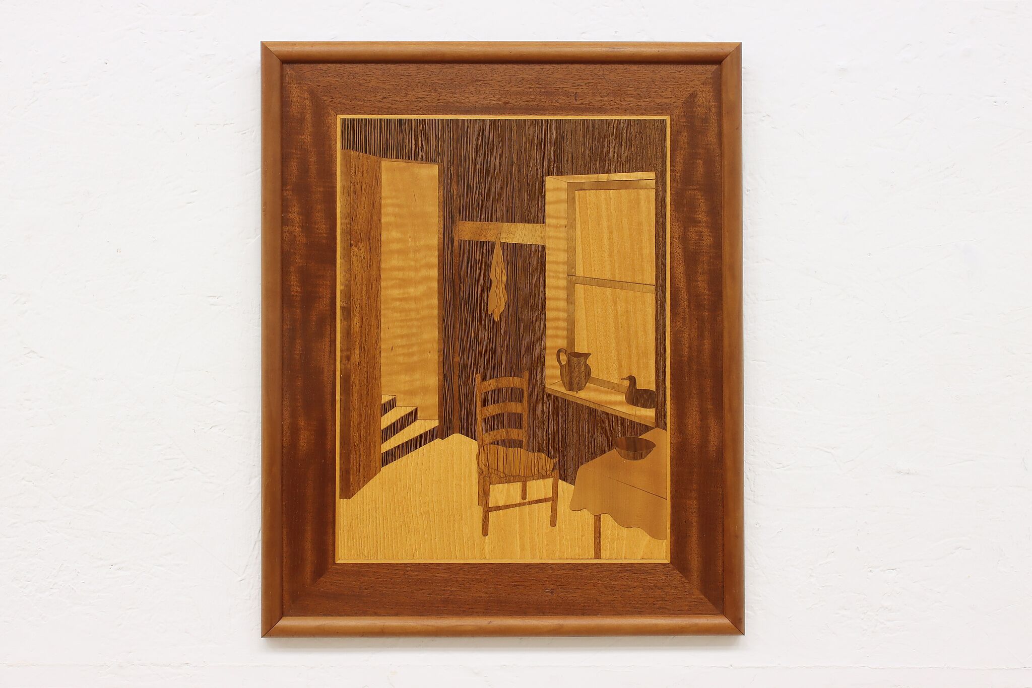 This beautiful marquetry wall plaque has a cozy scene of a cat taking an afternoon nap in a cabin.
