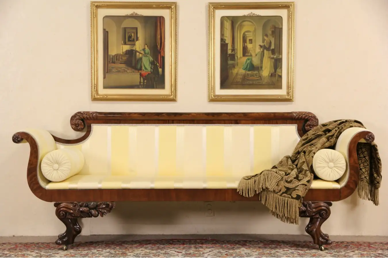 The finish is in very fine condition, the frame has been reglued to be strong and sturdy for another generation. Round bolster pillows are authentic. The upholstery is not worn but has not been cleaned, and the seat is authentic, and is very lightly padded and not comfortable. This historic antique furniture could be padded and upholstered as desired. Brass wheels are removable.