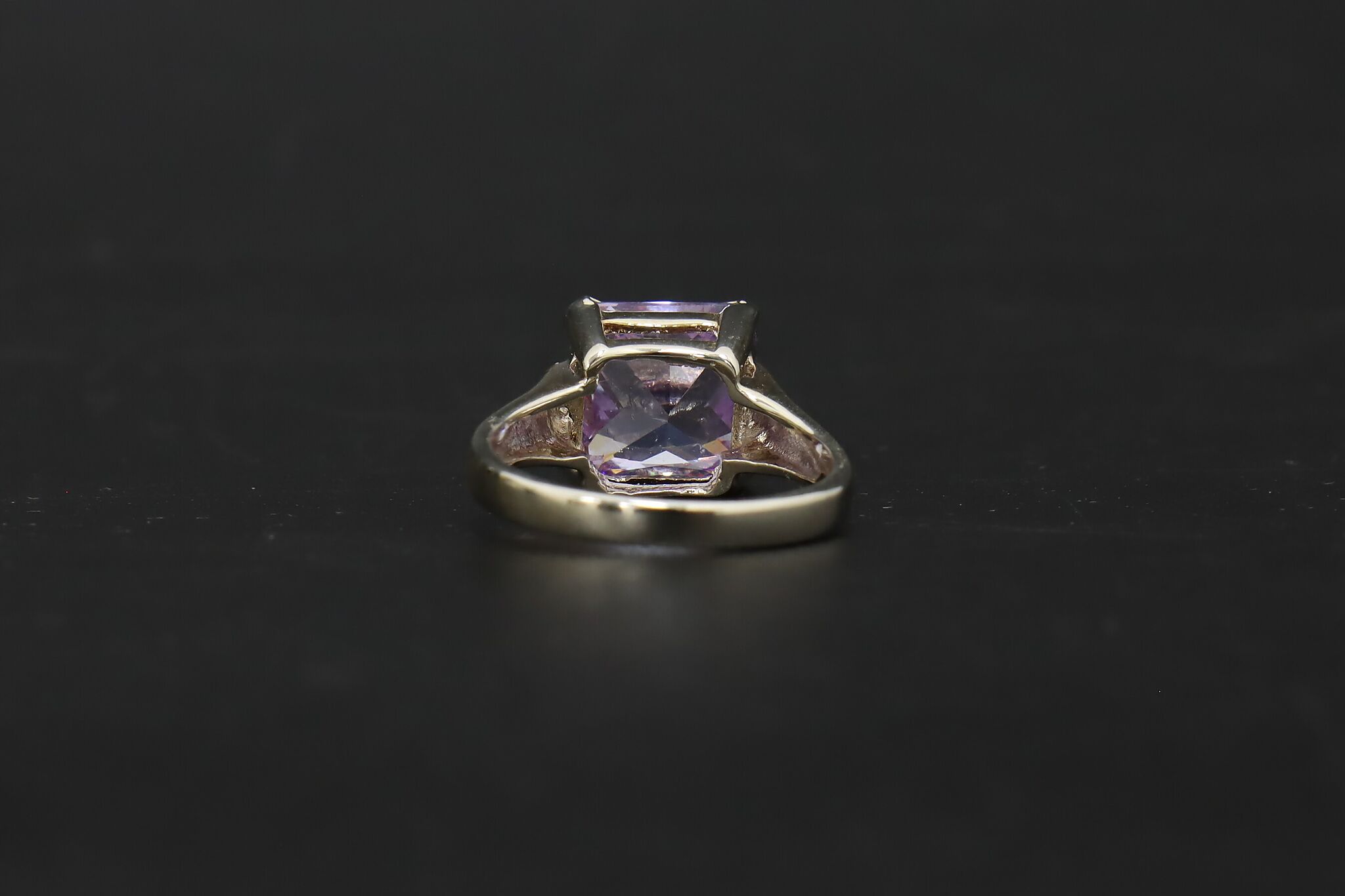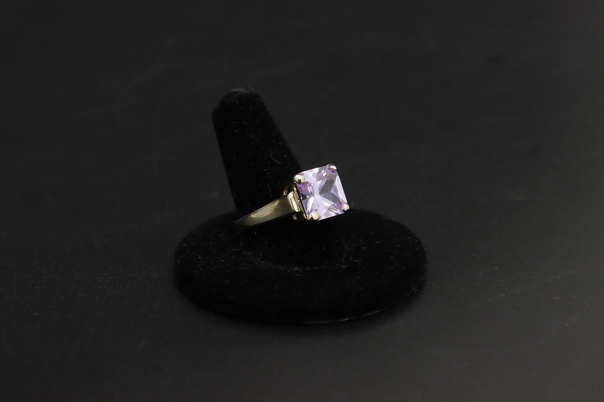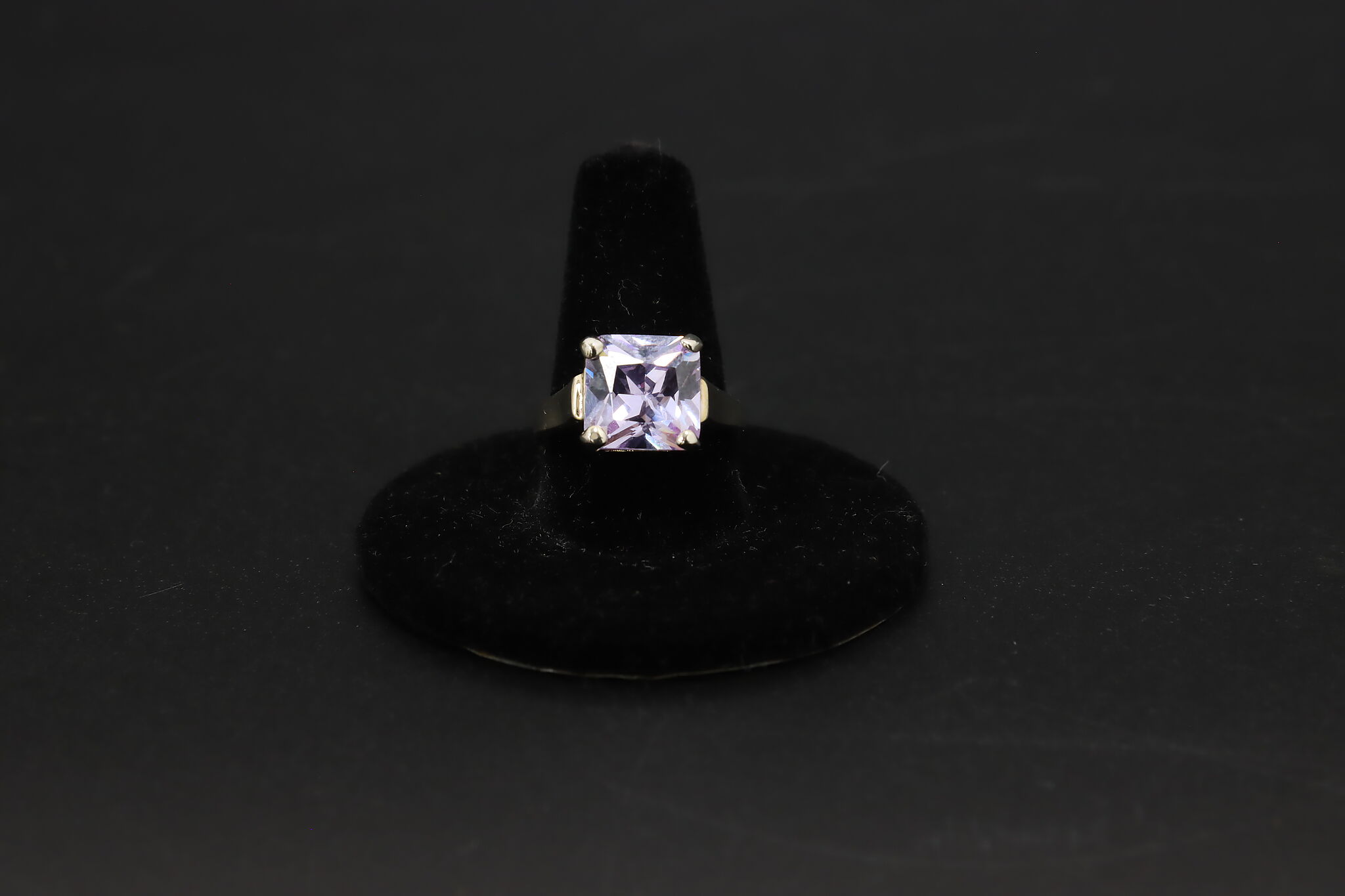 The beautiful square-cut amethyst colored cubic zirconia gemstone on this ring is absolutely fabulous.