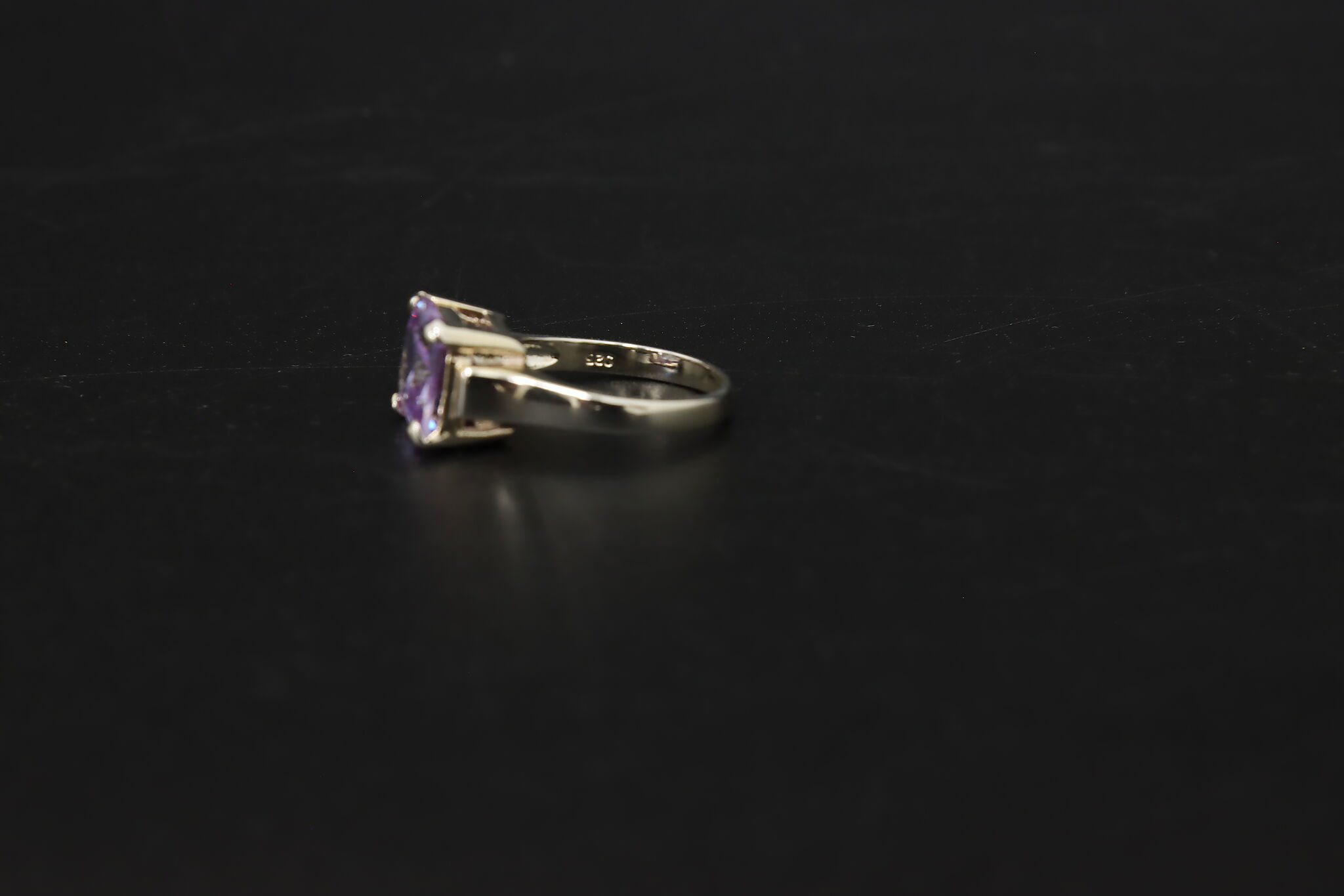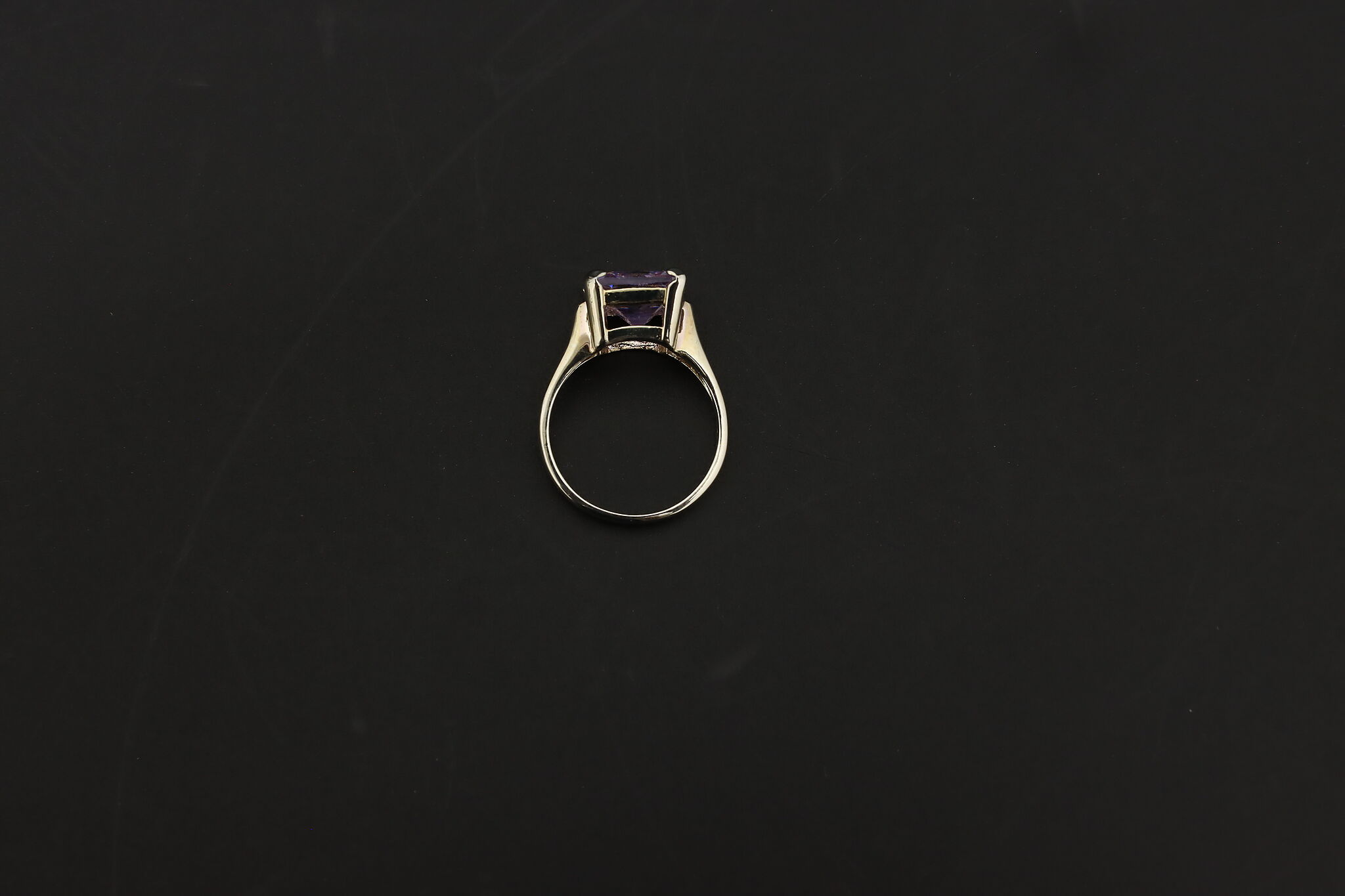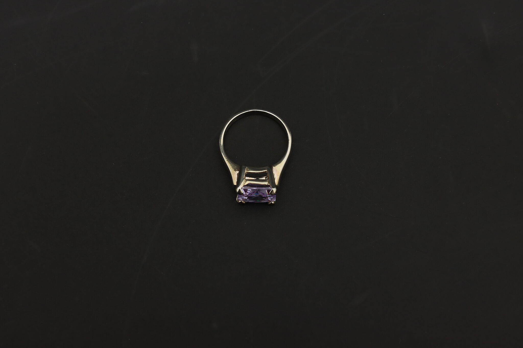 The beautiful square-cut amethyst colored cubic zirconia gemstone on this ring is absolutely fabulous.