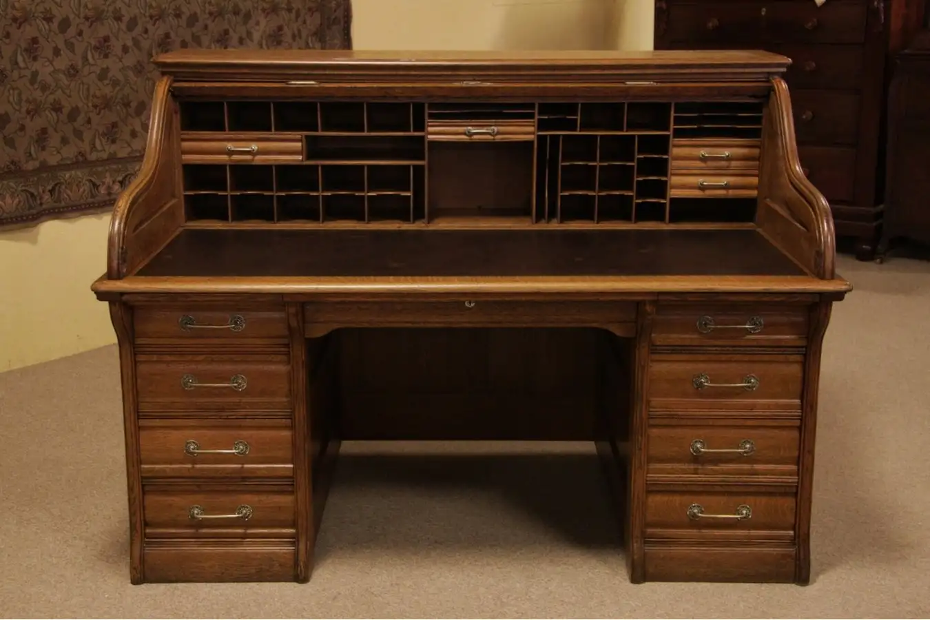 The golden finish is superb, with just enough wear to give a nice patina to this iconic desk. Cast brass hardware is original, deep drawers have dovetailed sides, and there are mail slots at both ends. The locking mechanism appears incomplete, and the roll operates smoothly.