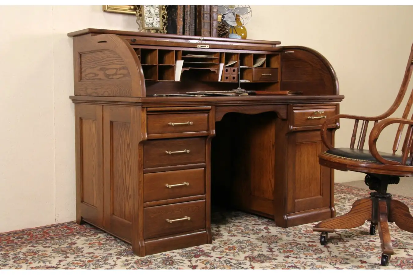Cast brass hardware and working locks are original. Deep drawers have dovetailed joints. The "C" shaped roll top glides smoothly, there are mail slots at both ends. Inside is a well worn and ink stained leather writing surface, see photos. Drawers and cubicles of various sizes plus four tiny round bottom pen and pencil drawers are inside.