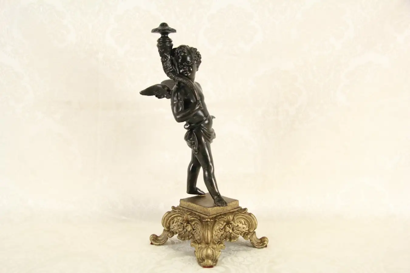 A sculpture of an angel or cherub holding a trumpet horn dates from the 1890's, and was cast in spelter, a white metal alloy similar to pewter. There is wear to the original deep patina finish on this sweet antique statue.