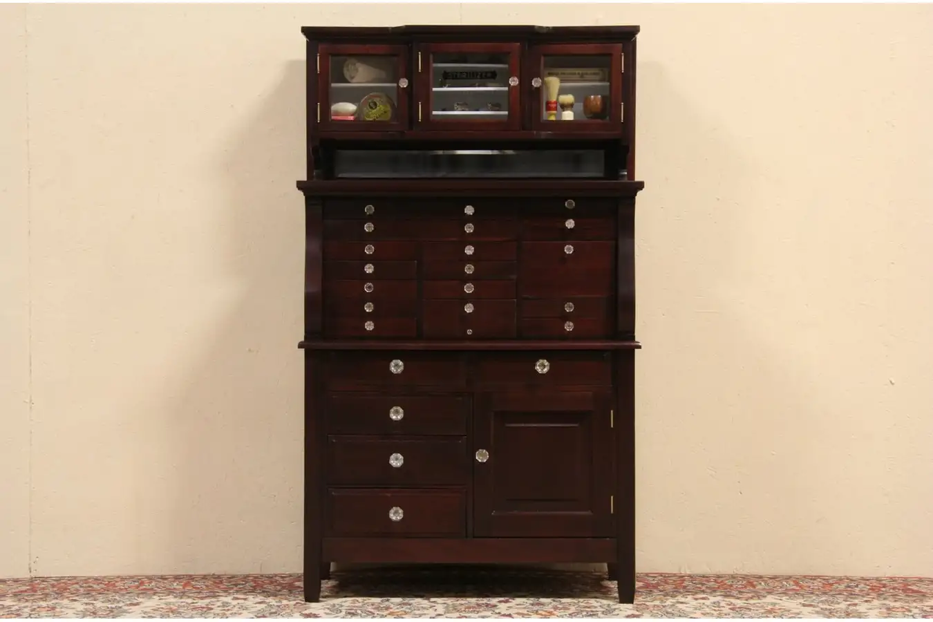 There are 21 drawers of various sizes in this solid mahogany dentist's cabinet from the early 1900's. This would be lovely for a jewelry collection, or useful for a collector or hobbyist.