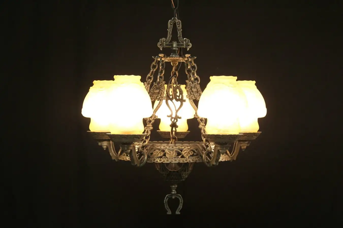 Signed "Moe Brothers, Milwaukee," this 1920's chandelier is hammered iron and has 5 original etched glass shades, 2 have minor damage: one has a chip at the base that does not show, one has a burst outer bump on the side, not all the way through.