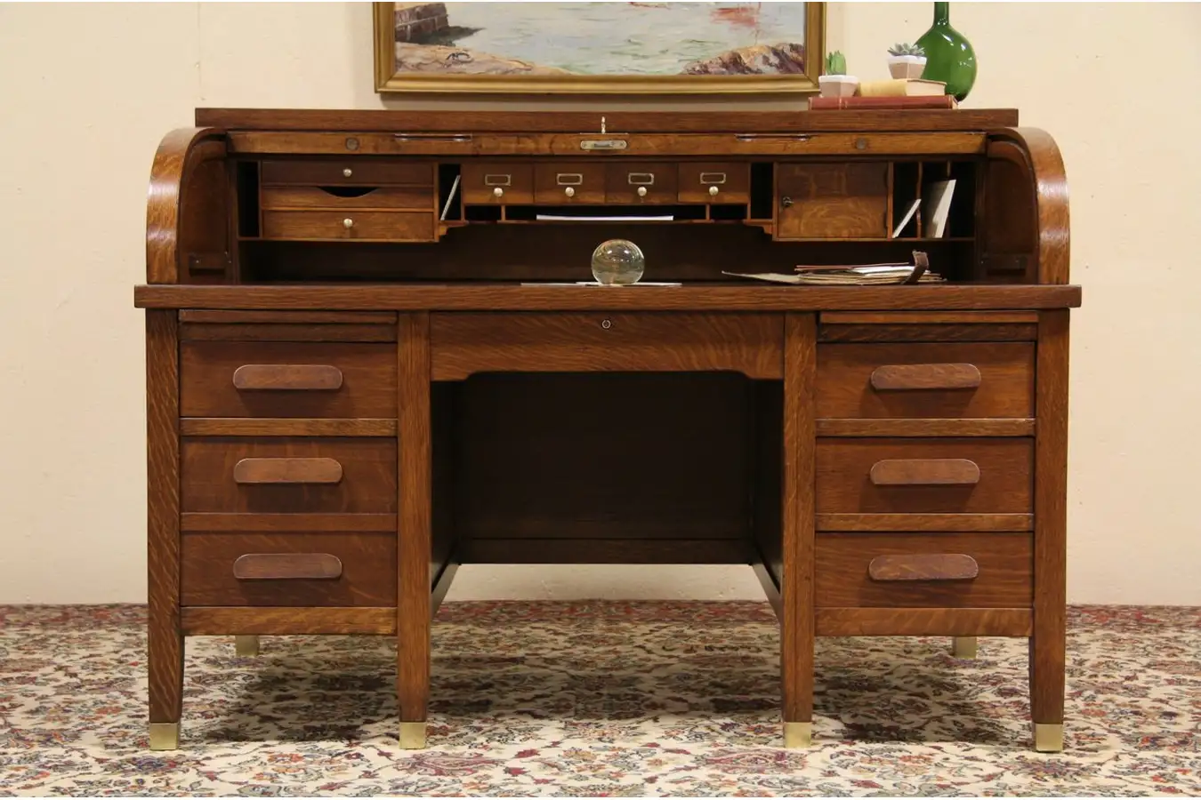 Deep dovetailed drawers include a large file drawer, two pull-out shelves add workspace. The "C" shaped roll operates smoothly, the lock works. Inside are tiny compartments, drawers and a compartment with a key for a handle only, plus letter holders at each side.