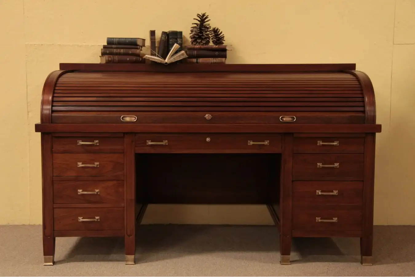 Cast heavy weight bronze pulls and feet are original. Deep dovetailed drawers include a large file drawer with dividers, two pull-out shelves add workspace. The roll operates smoothly, inside are tiny compartments and drawers. Locks do not have working keys, they could be keyed by a locksmith if desired.