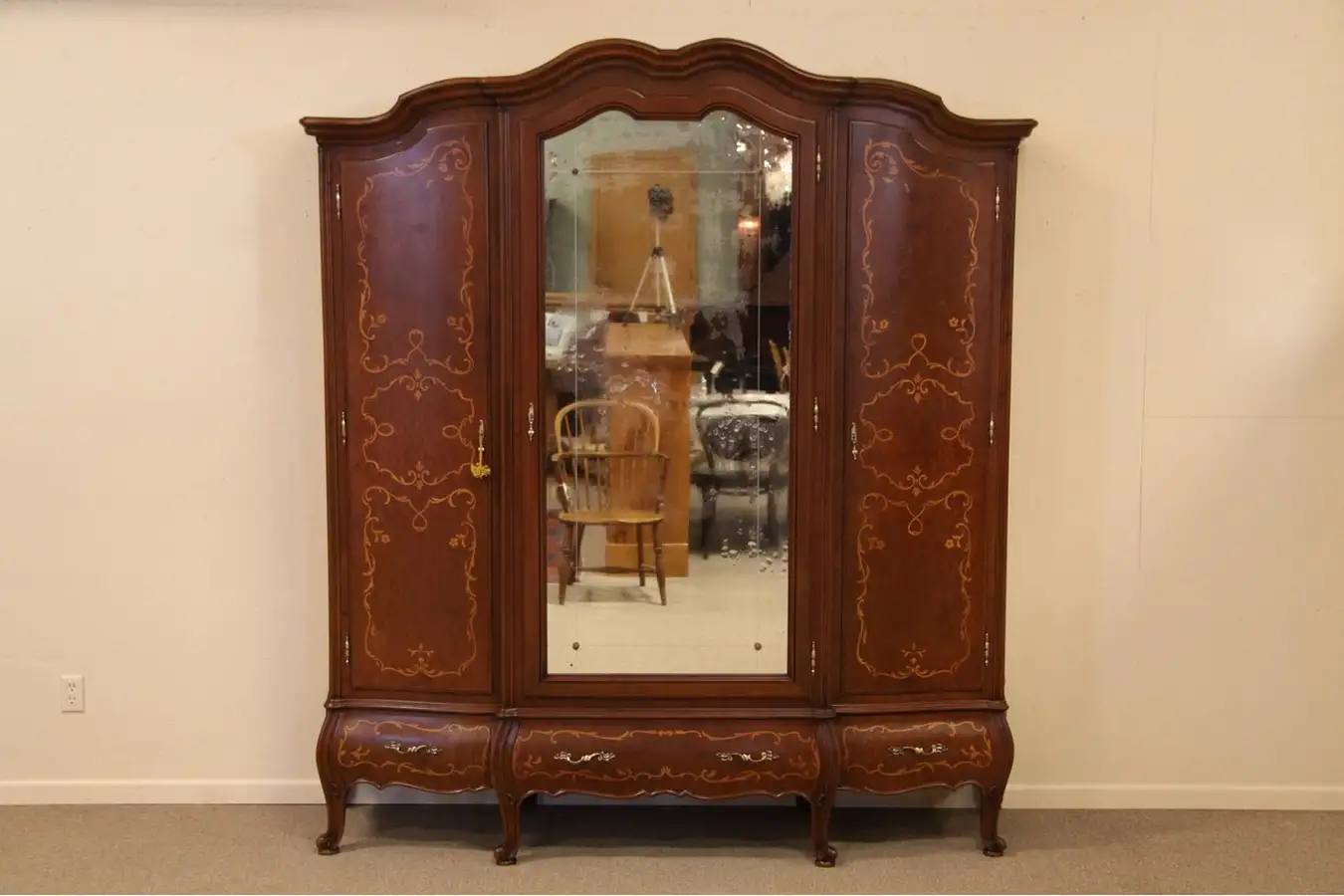 A spectacular "Bombe" or convex shaped triple armoire has inlaid marquetry design. The satiny finish on matched walnut burl is very fine with beautiful antique patina and character - there are the usual small shrinkage separations and minor mars plus the typical irregularities of burl. Brasses are original, drawers have solid oak sides with hand-cut dovetails.