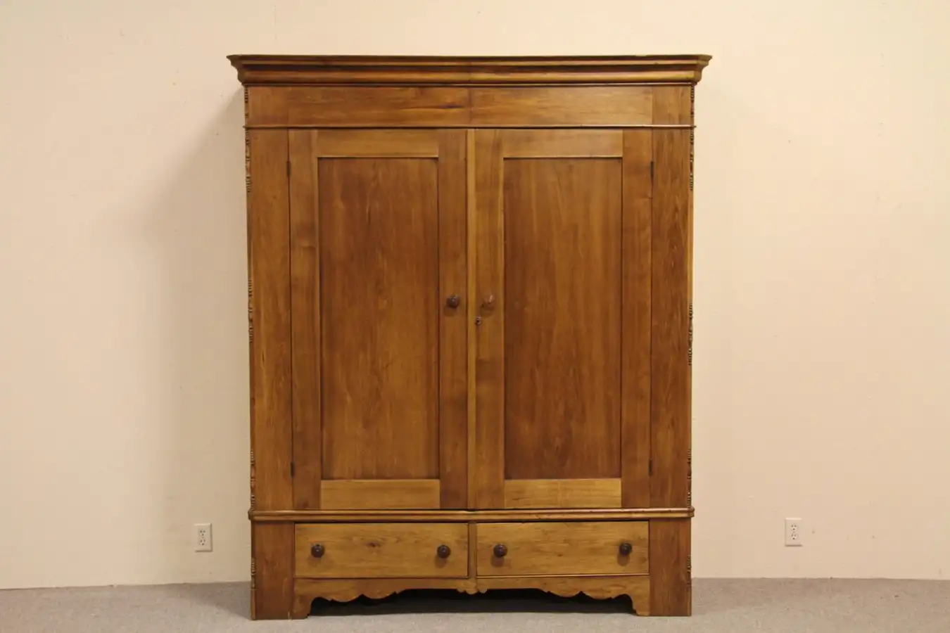 Ruggedly built, the original turned knobs are attached with wooden screw dowels. Deep drawers have hand cut dovetails, the door lock is operational. Inside are later pine shelves that are removable, the interior is 19" deep and would accommodate a closet pole if desired.