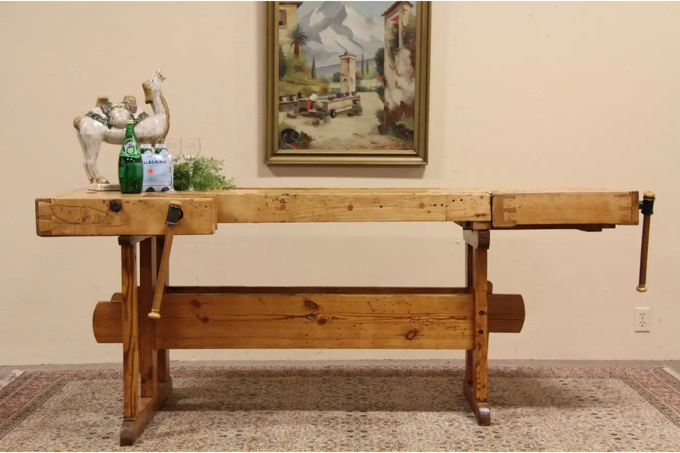 Used for generations by cabinetmakers, this authentic carpenter's or woodworker's workbench dates from about 1895, and would make a picturesque wine and appetizer table, kitchen island or wide screen tv base