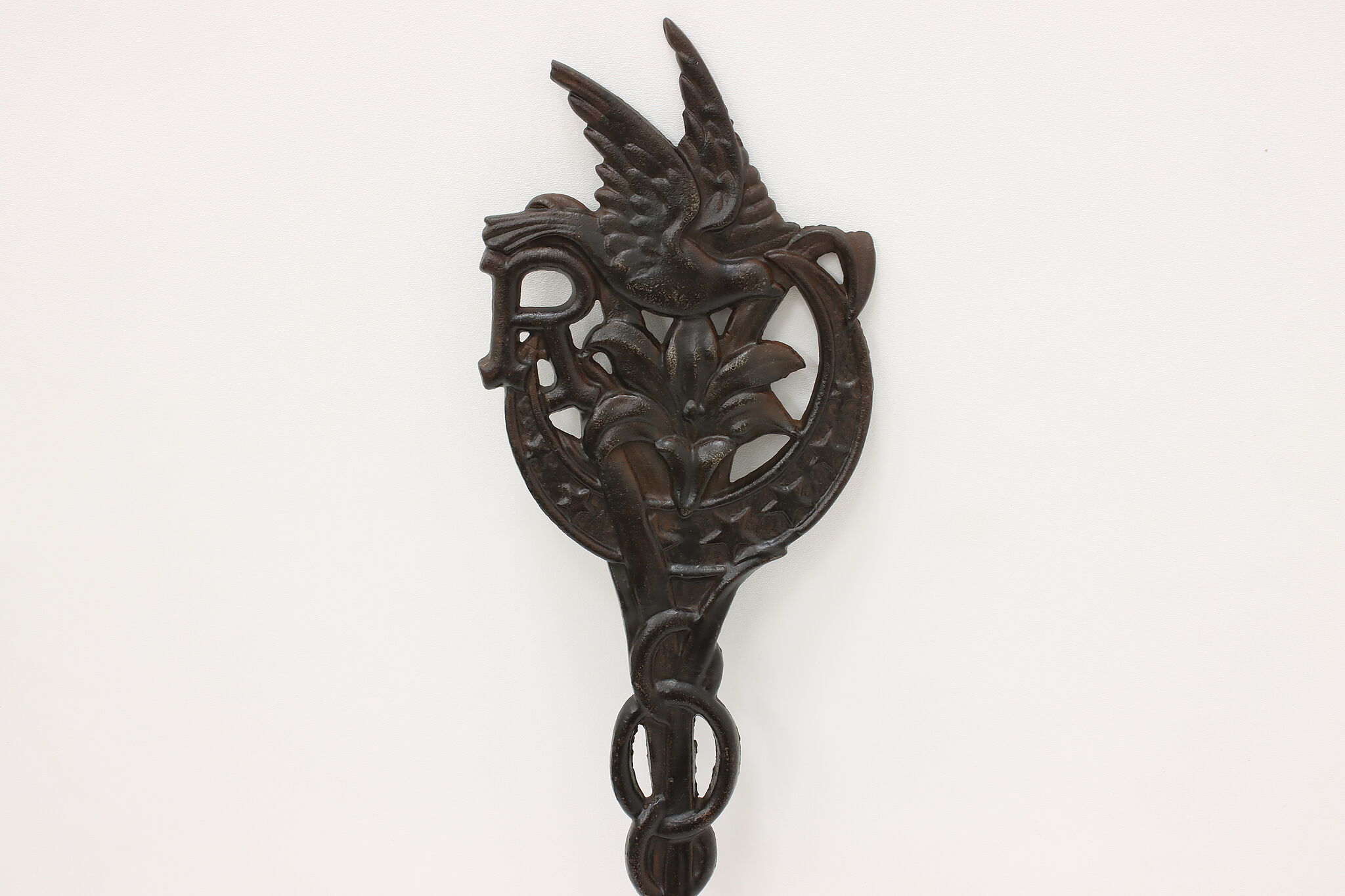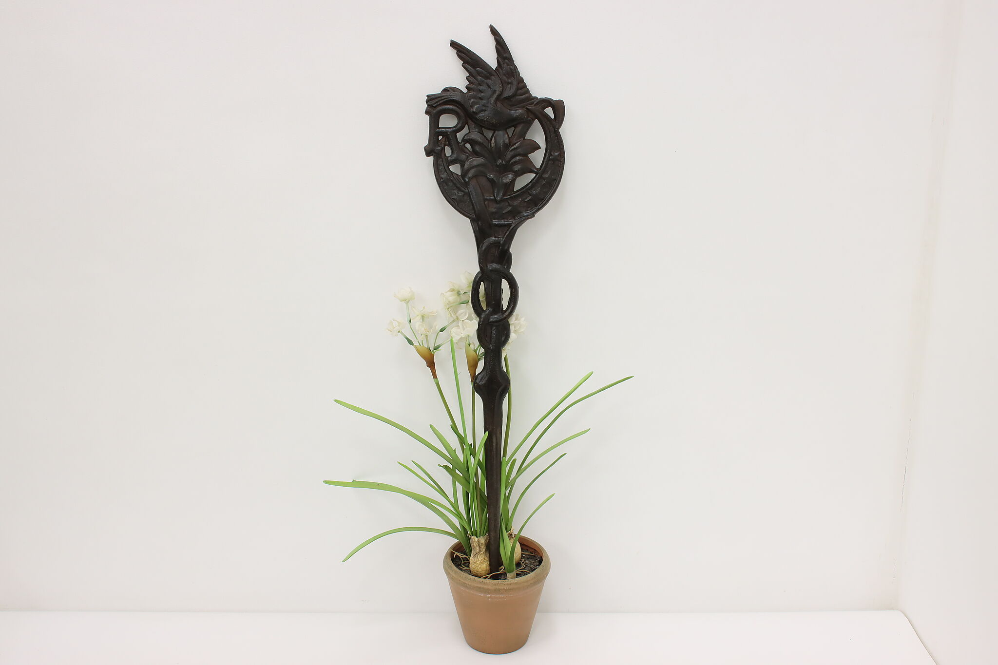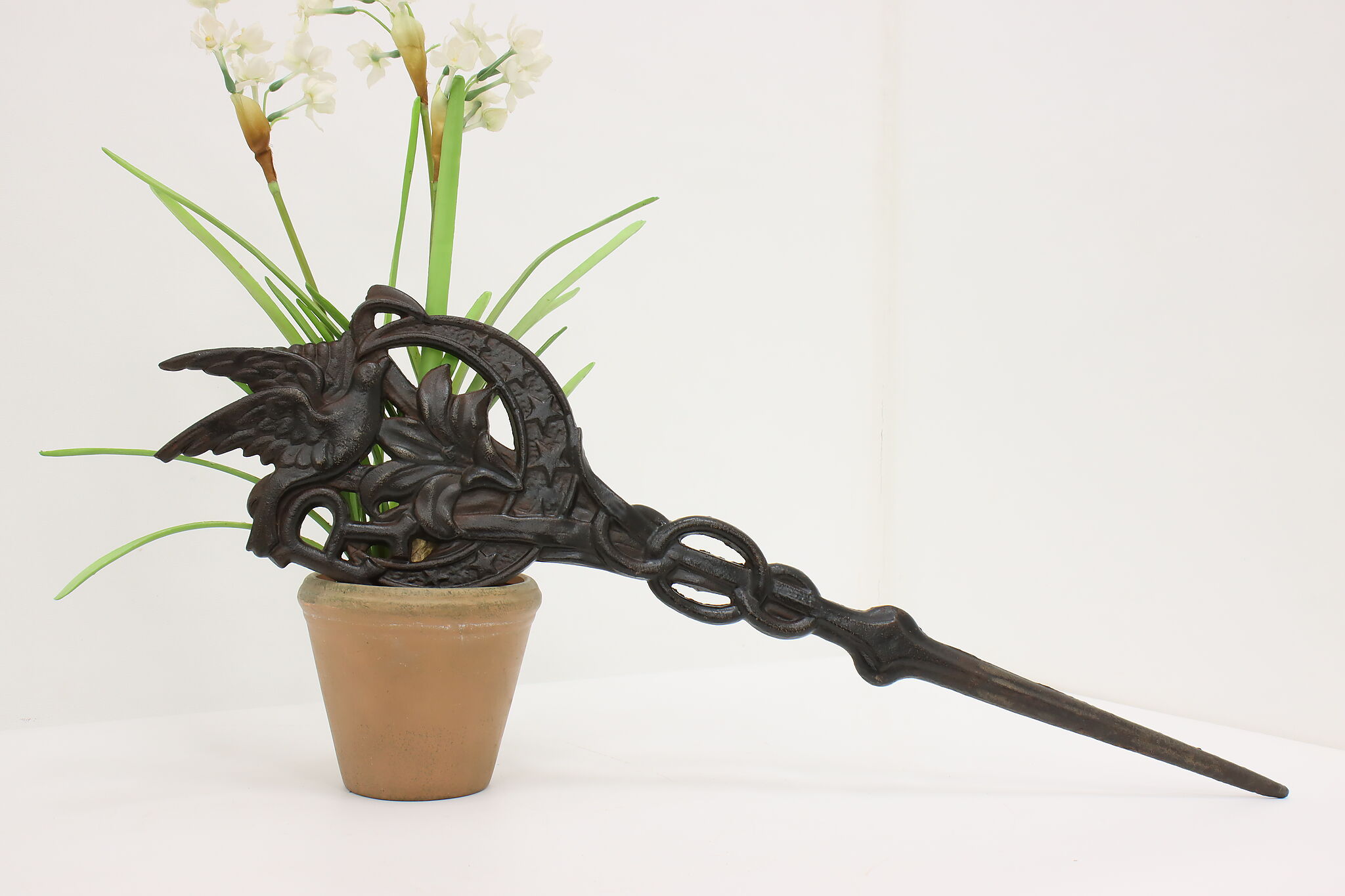 This beautiful garden stake, marker or flag holder has a bird and lily flower motifs.