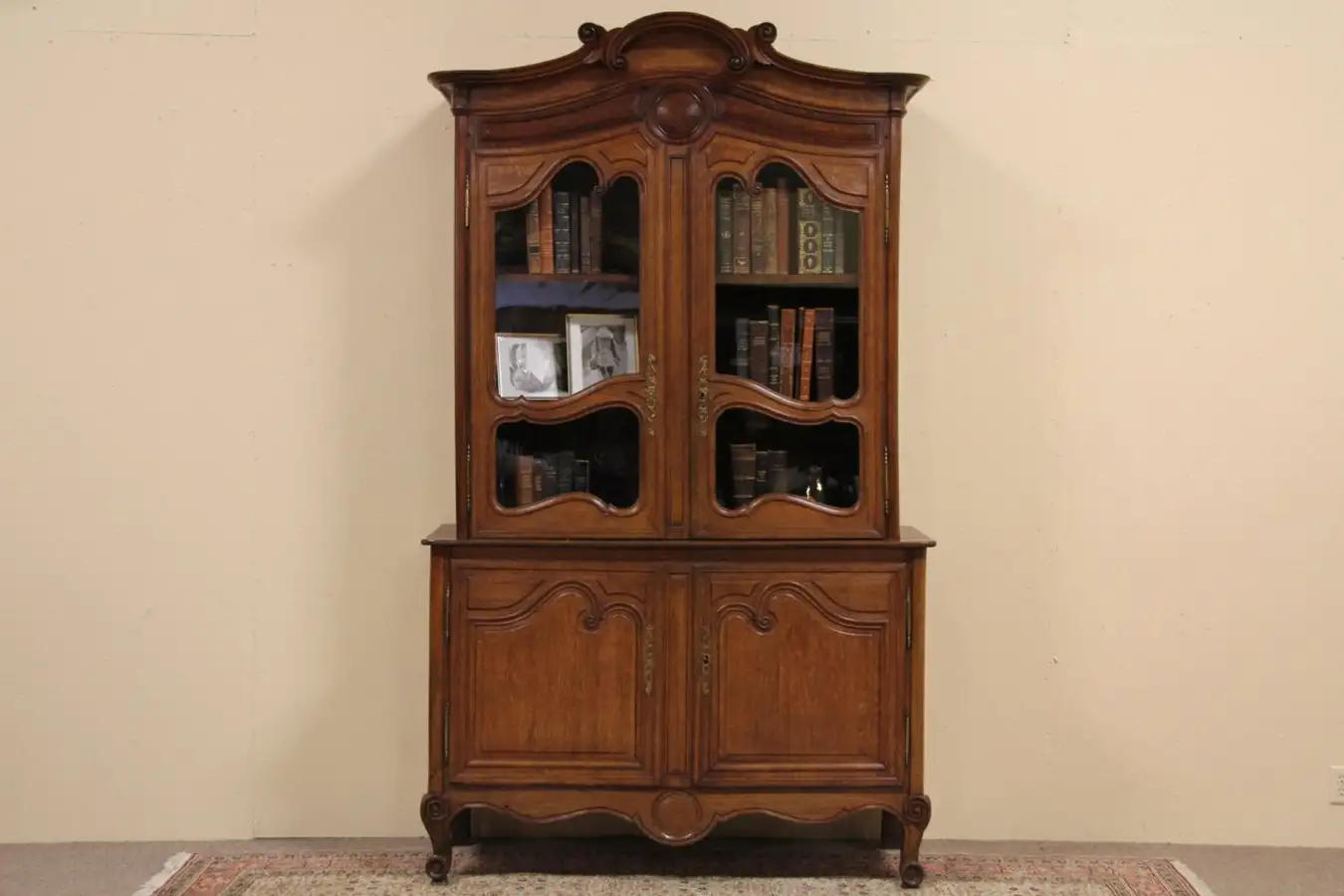 A magnificent French Provincial bookcase or china cabinet was hand carved of solid fine grain oak about 1850 in the Louis Philippe manner.