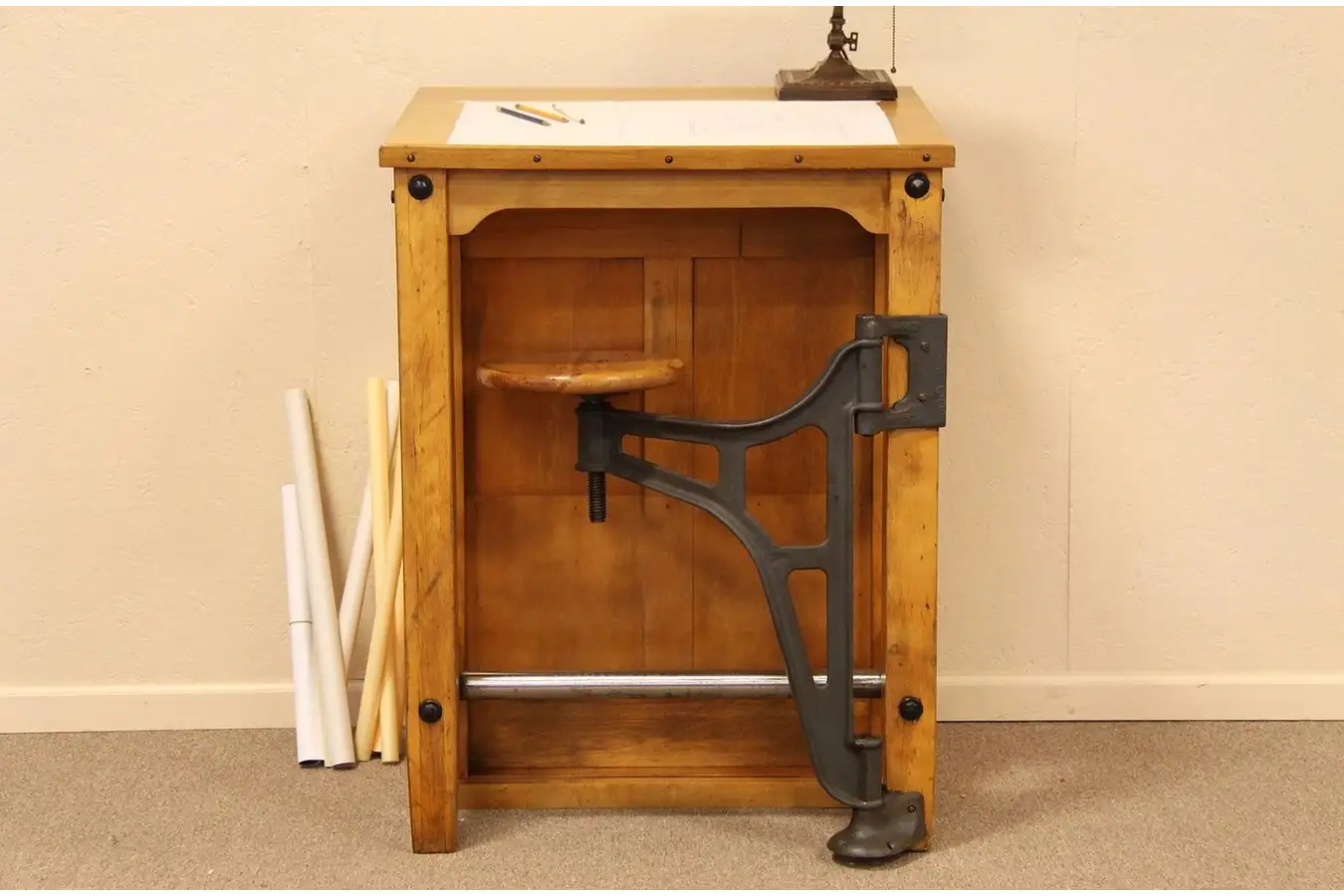 This slant top drafting or drawing desk was originally used in art and architectural drawing classes, and would be useful to many artists. Solid birch and maple, the top slopes. Used either standing or with the stool, there is an iron foot rest. The swivel stool has adjustable height and is removable.