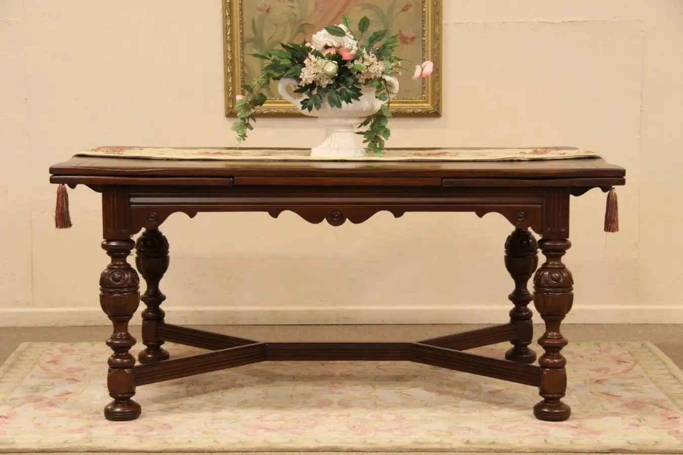 A beautiful antique oak dining or library desk recaptures the spirit of Henry VIII and English Tudor design, and is signed by famous American maker, "Berkey and Gay." In wonderful condition, this table has 2 pull out leaves.