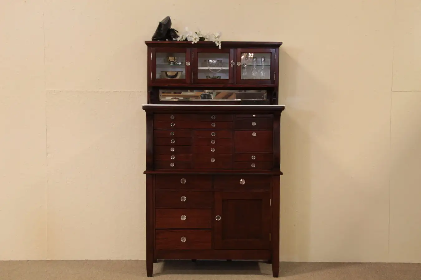There are 20 drawers of various sizes in this mahogany dentist's cabinet with a beveled mirror - this would be a lovely home for a jewelry collection, or for a collector or hobbyist.