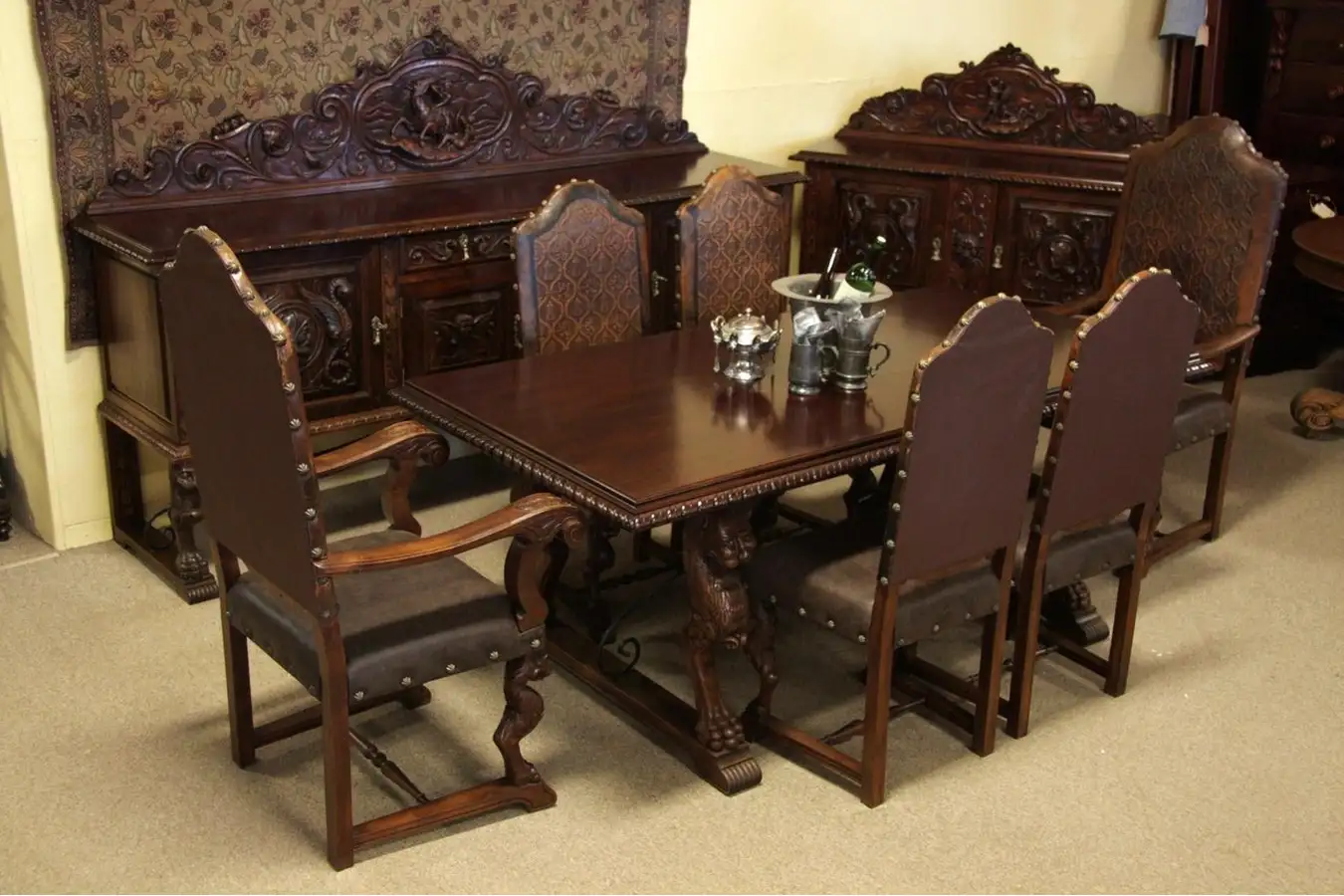 Spectacular carvings of conquistadors, angels, gargoyles and lions adorn this Spanish Colonial 9 piece dining set. Hand carved in realistic high relief by skilled Spanish artisans about 1920, this set consists of a table, 6 embossed leather chairs, a large sideboard or buffet, and a huntboard or liquor cabinet.