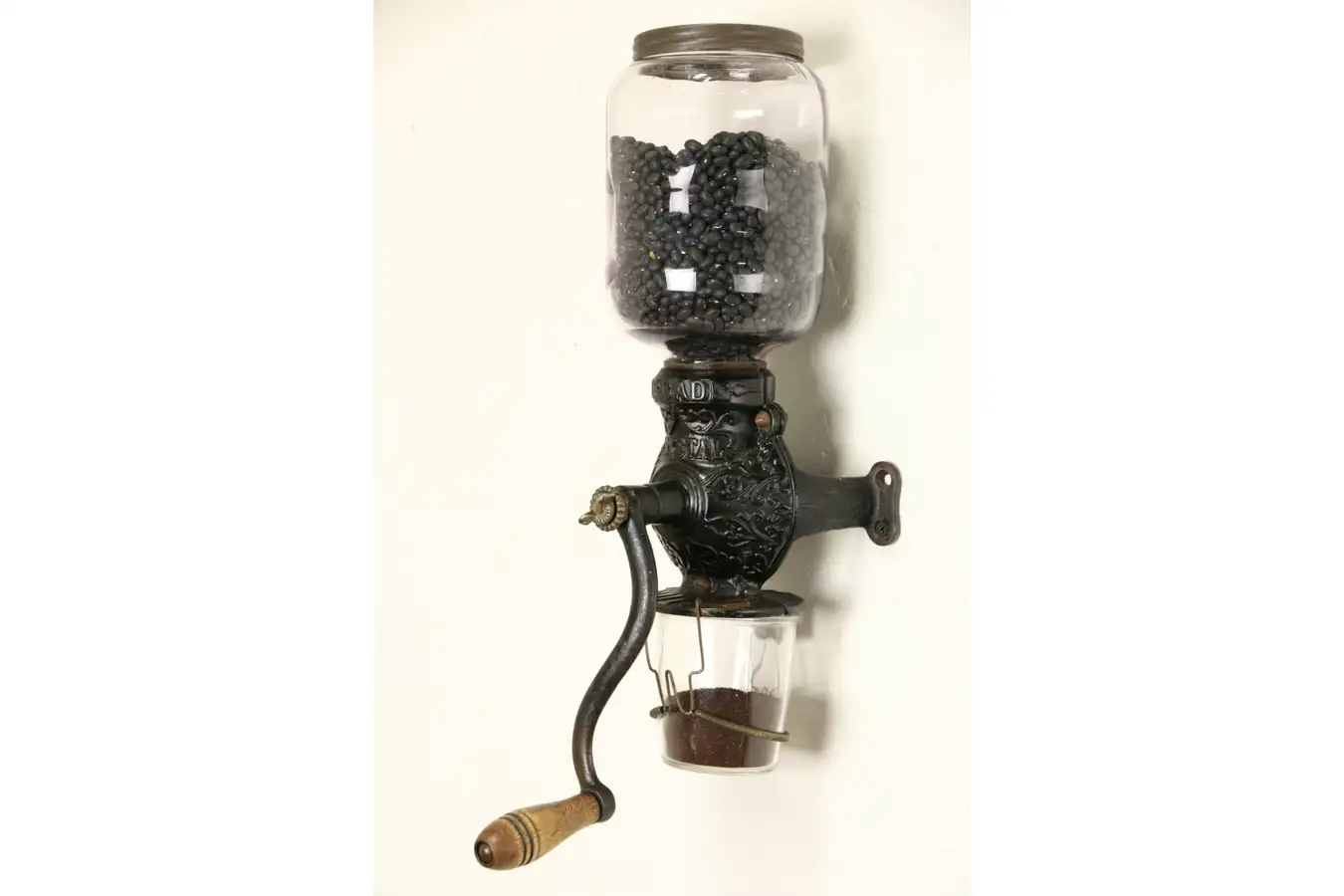 Signed "Arcade Crystal," this wall mount coffee grinder dates from the 1890's. The embossed cast iron mechanism has worn original paint. An original tin lid screws onto the jar for beans, there is a glass receiver cup and springs to hold it in place.