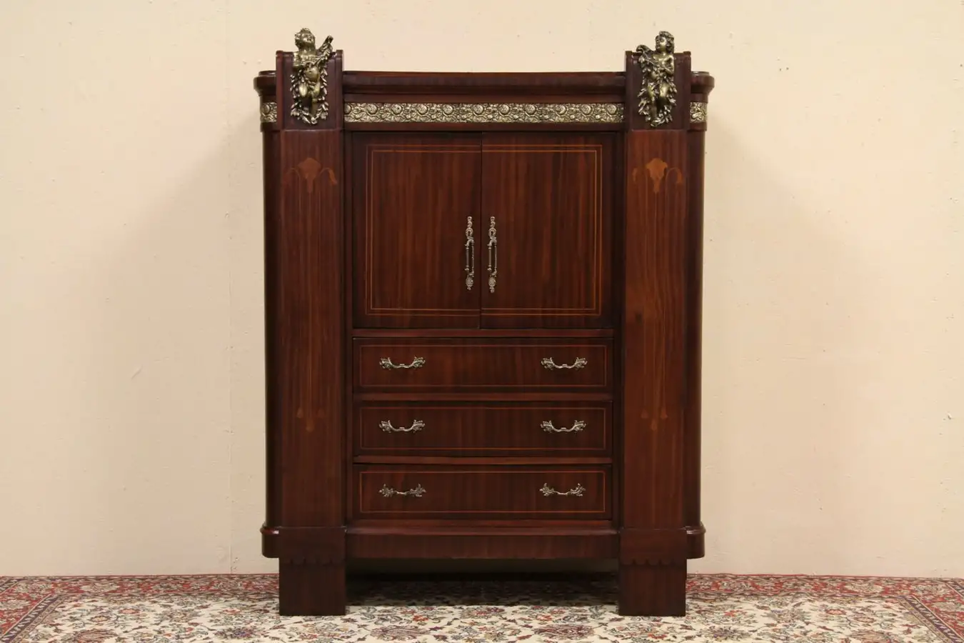 An armoire, bar cabinet or chifferobe is mahogany, with marquetry inlay and cast bronze sculptures of cherubs or angels. This palatial antique was hand-made in northern Italy about 1910, and shows Art Nouveau influence.