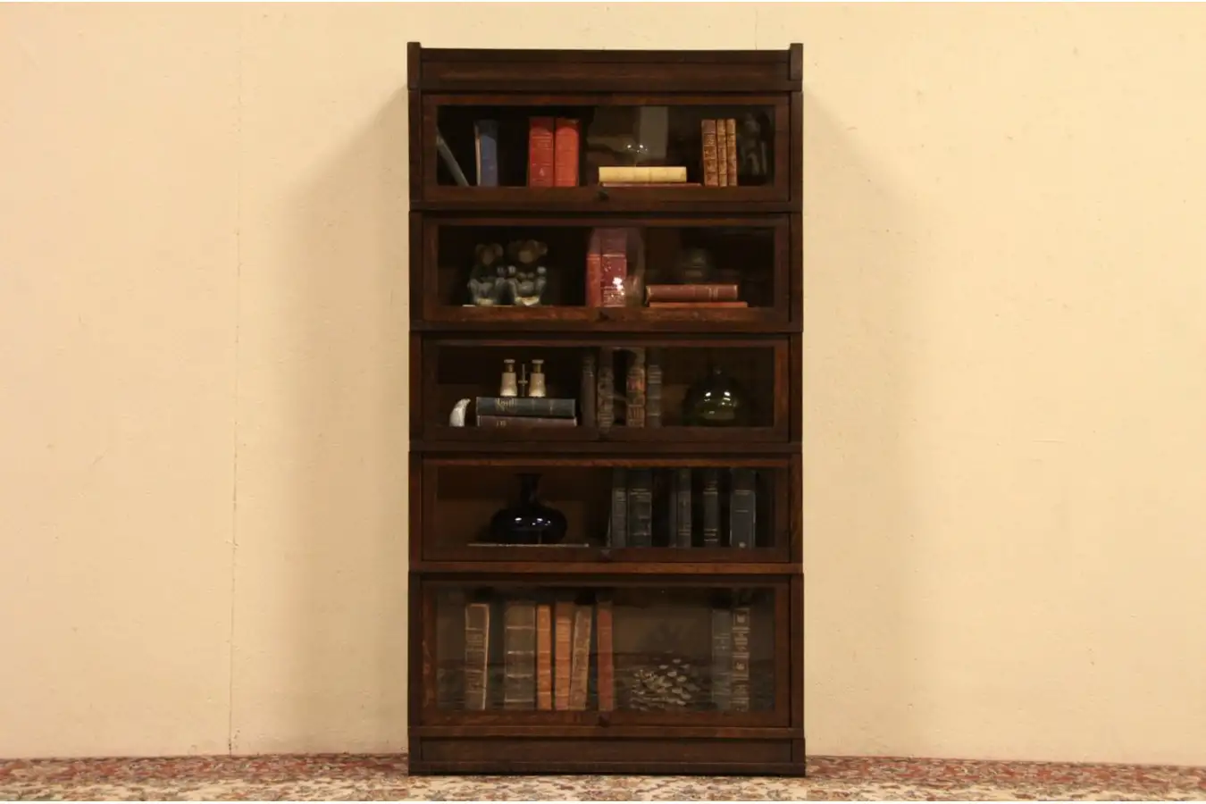 This five section stacking "lawyer's" bookcase is entirely original from about 1905 during the Arts and Crafts or Mission Oak period. The base and top are separate stacking pieces as well.