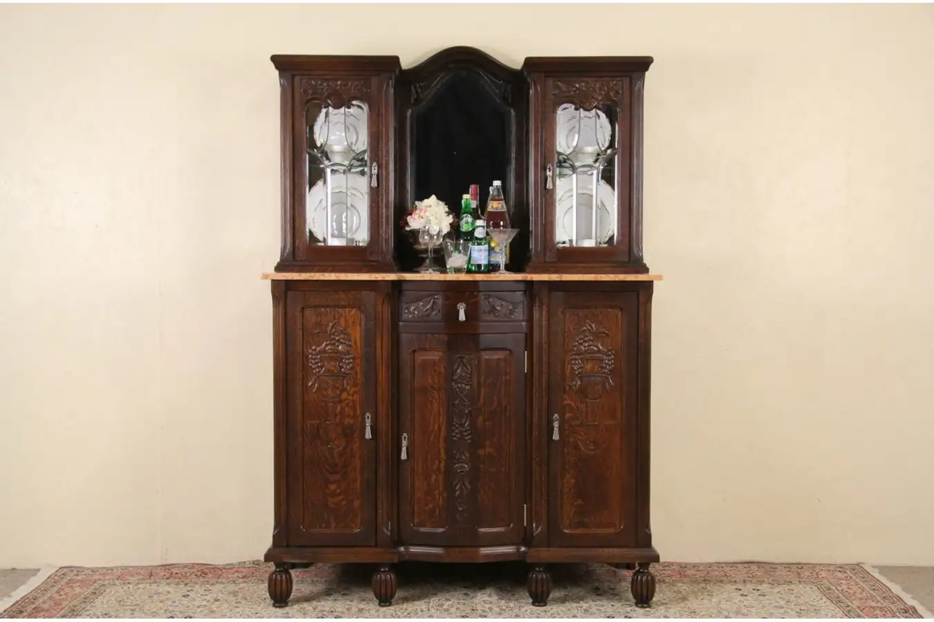 Masterfully carved of solid quarter sawn oak, the deep finish is in excellent condition. The salmon marble has been polished and sealed to resist stains. Hardware and working locks are original on this European furniture.