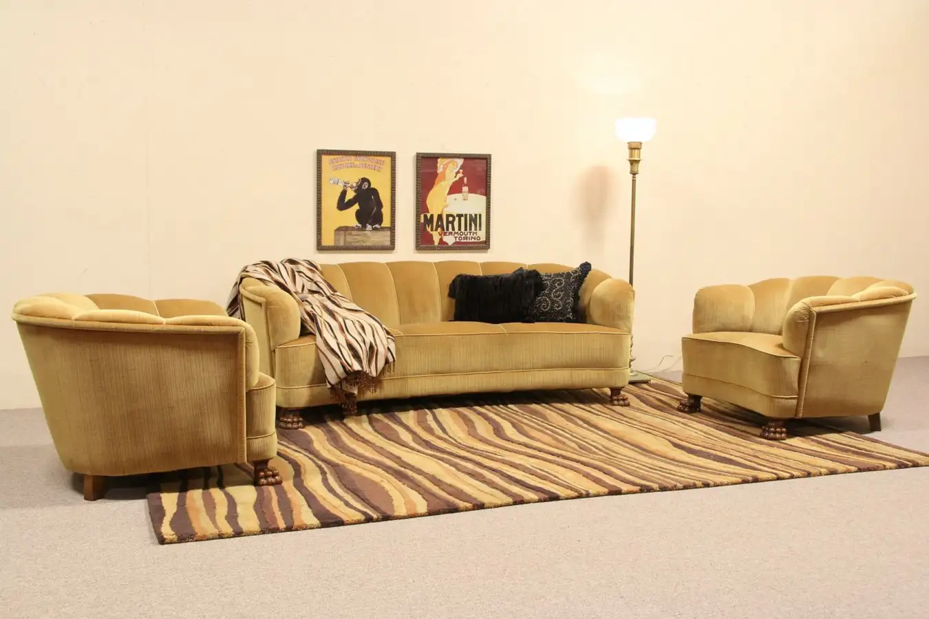 Gently curved on all sides, genuine Art Deco late 1930's club chairs and sofa are all original, with carved oak lion paw feet. The channel tufted backs are dramatic and sleek, original velvet upholstery is in remarkably good condition with only minor worn or dirty spots, see photos. There is a small separation in the fabric on the bottom of one chair where it meets the seat, see photo.