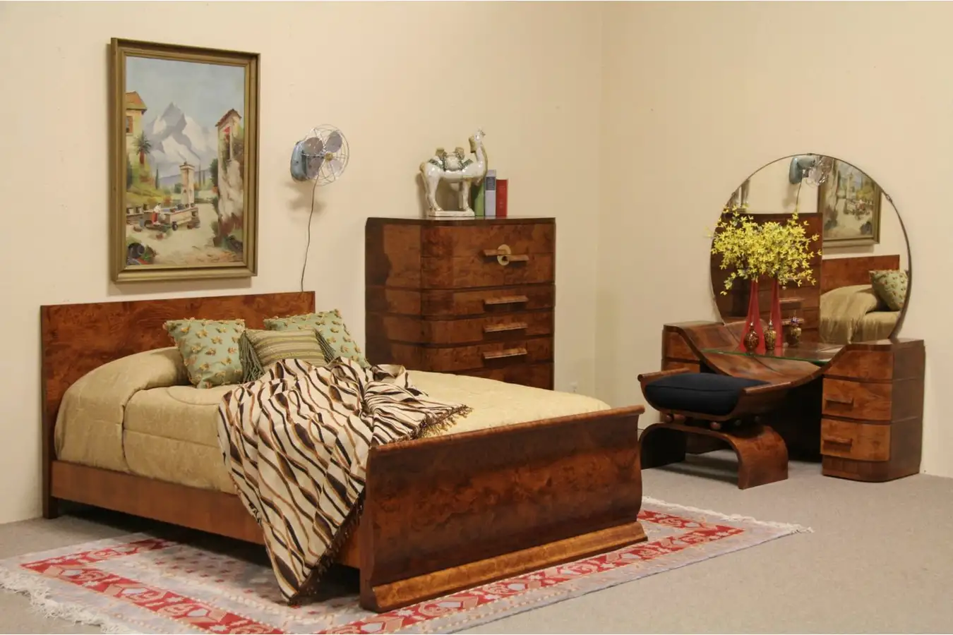 An Authentic Art Deco design set was beautifully crafted about 1935. This four piece bedroom set includes a bed, tall chest, dressing table and bench.