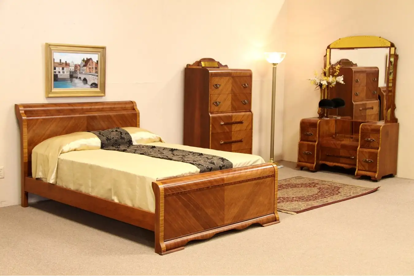 Sleek lines and beautifully figured wood are exceptional on this 3 piece Art Deco 1930's "waterfall" bedroom set. The set includes a tall chest of drawers, dressing table or vanity with arched mirror, and a standard full or double size bed. Reverse carved and golden mirrors are all original.