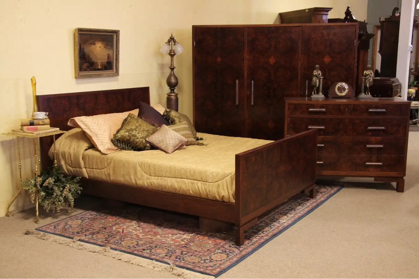 Authentic Art Deco antique furniture from the 1930's, this 3 piece bedroom set includes a queen size bed, large chest or dresser and triple armoire. All pieces are walnut with matched intricate burl.
