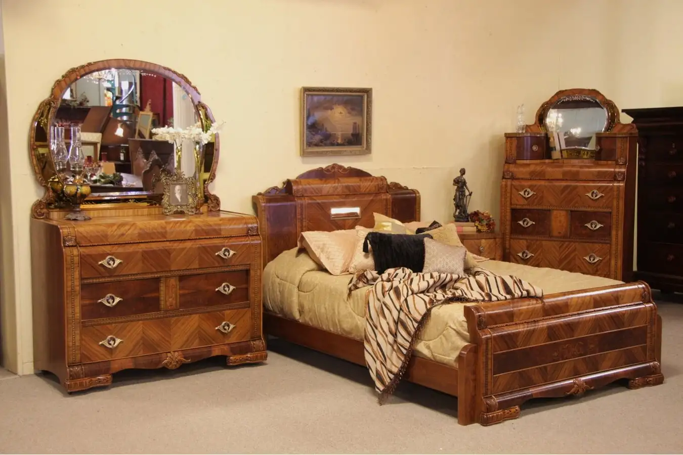 Absolutely stunning Art Deco design, this 4 piece bedroom set includes a queen bed, and has sleek "waterfall" design. Matched mahogany, walnut burl, zebra wood and inlaid marquetry all have gorgeous natural grain, enhanced by a gleaming finish in excellent condition, there are only minor mars at the edges.