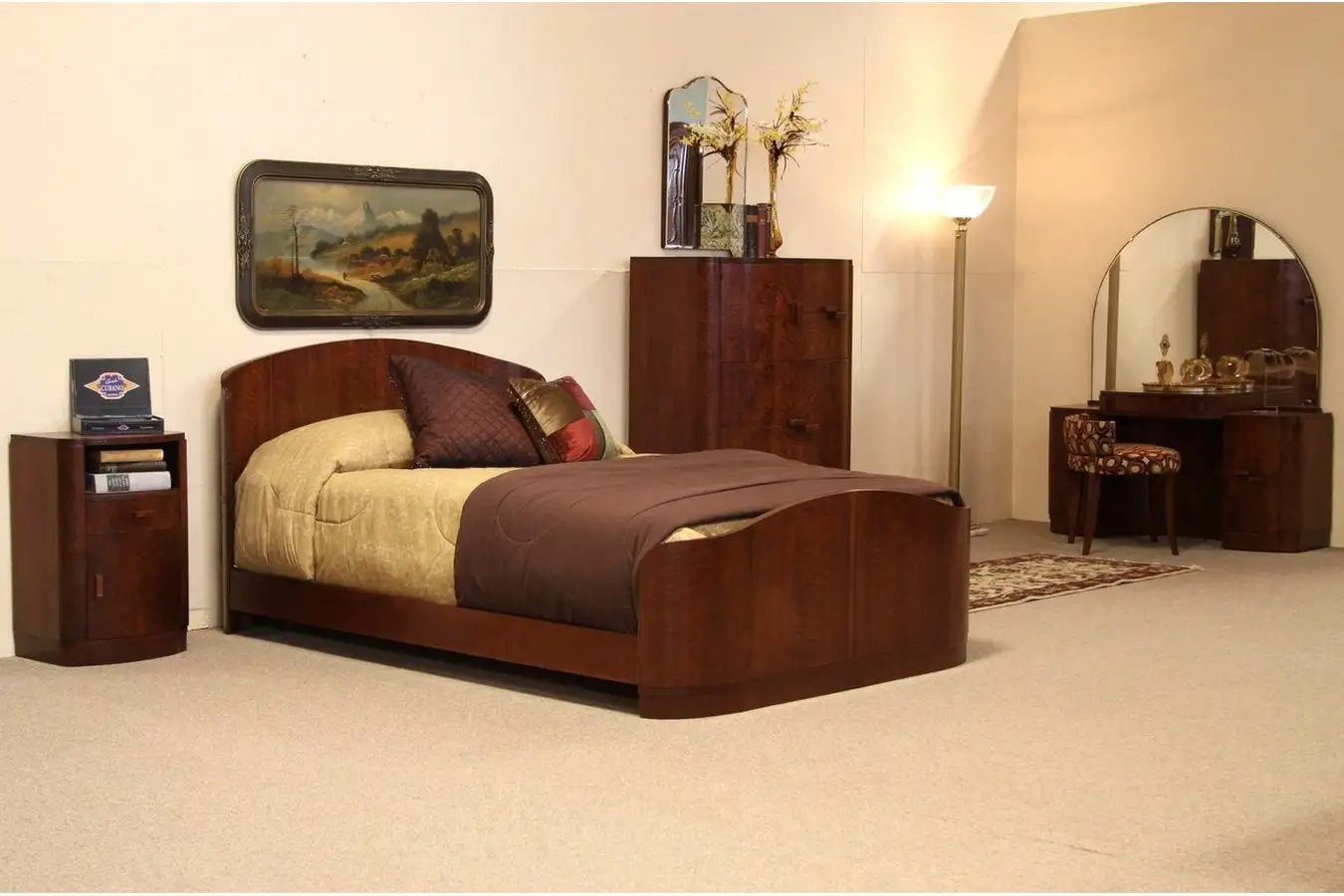 A sleek and glamorous Art Deco period bedroom set includes a full or double size bed, nightstand, tall chest of drawers, and a dressing table & bench.