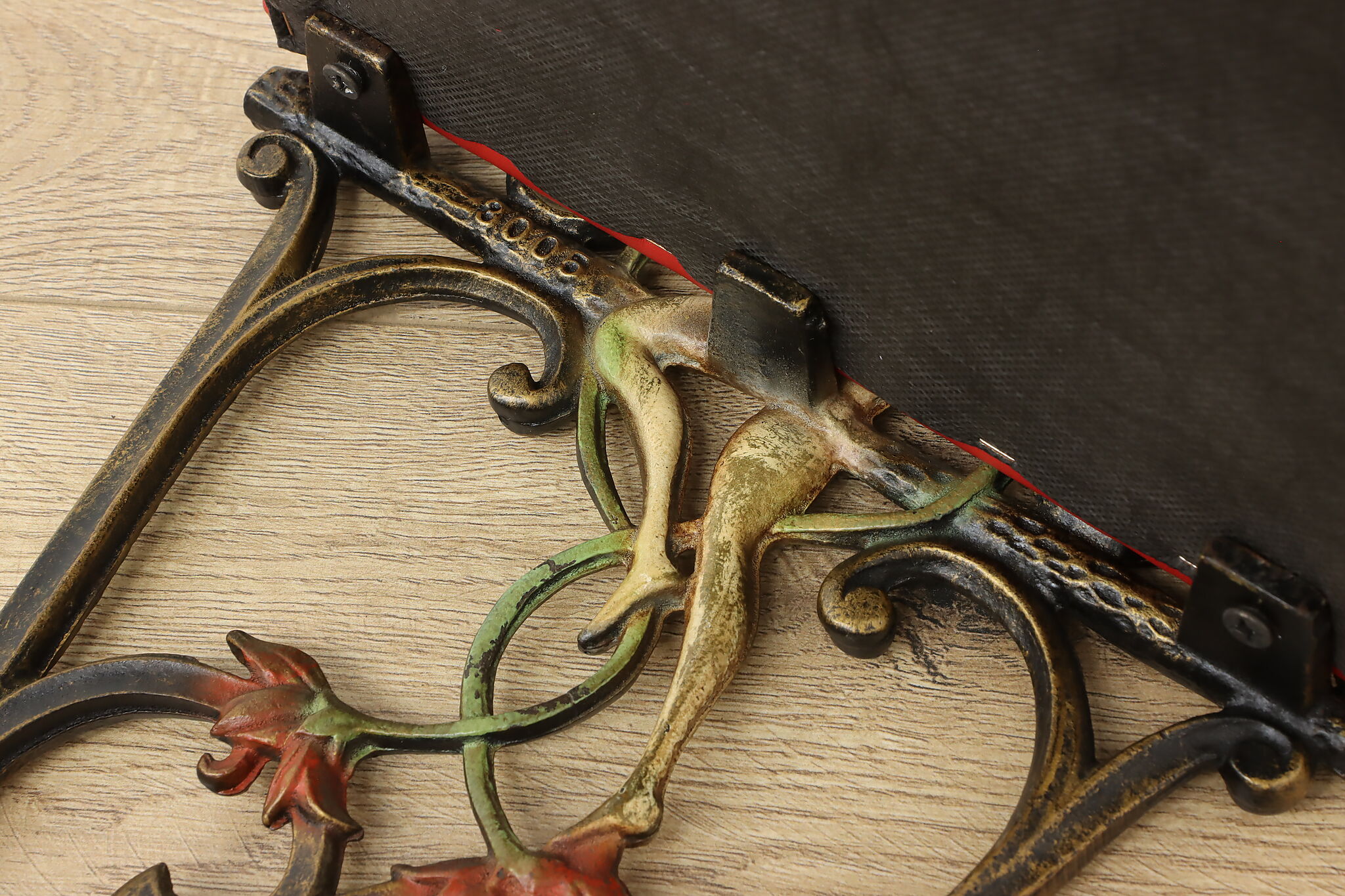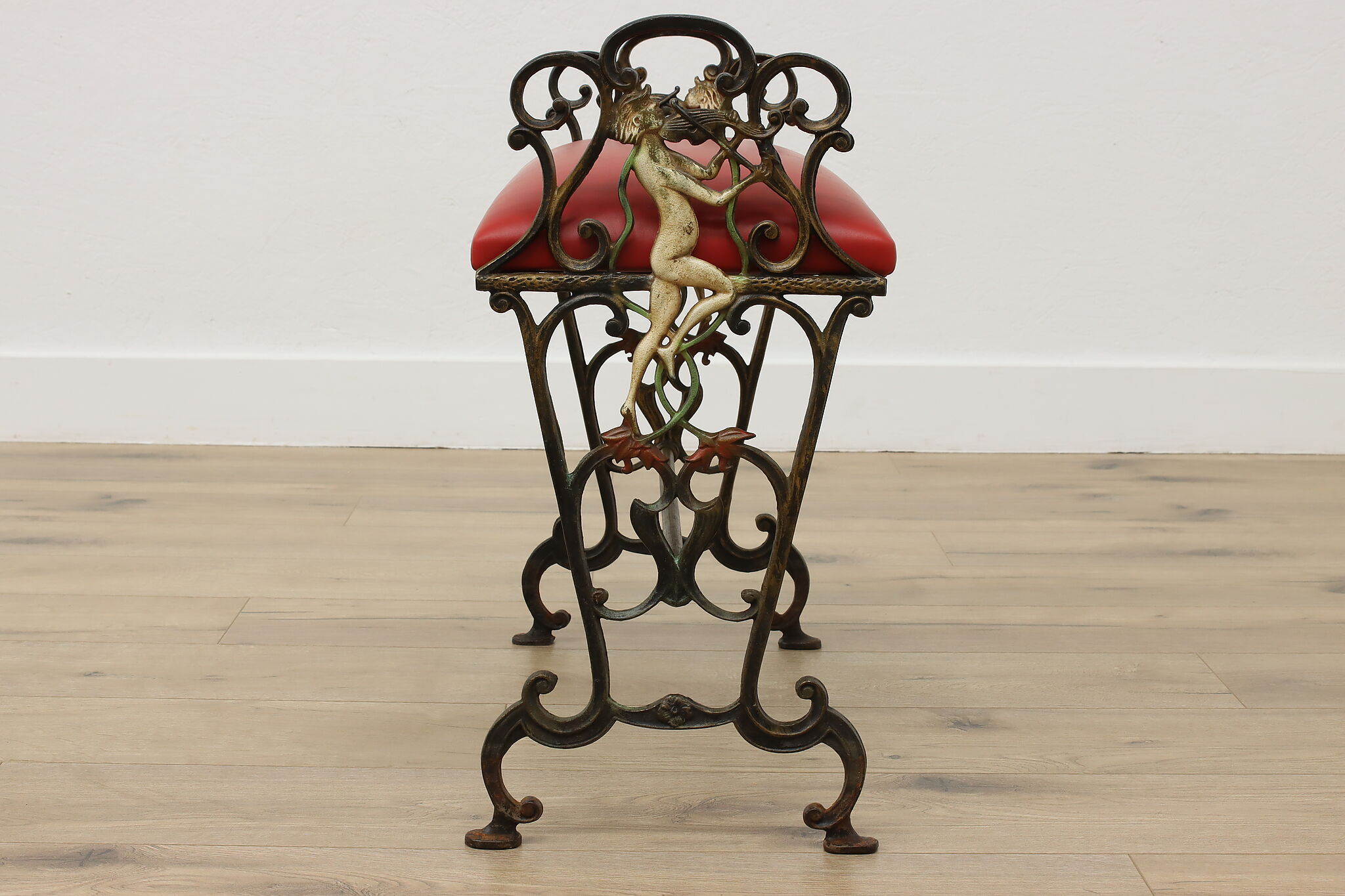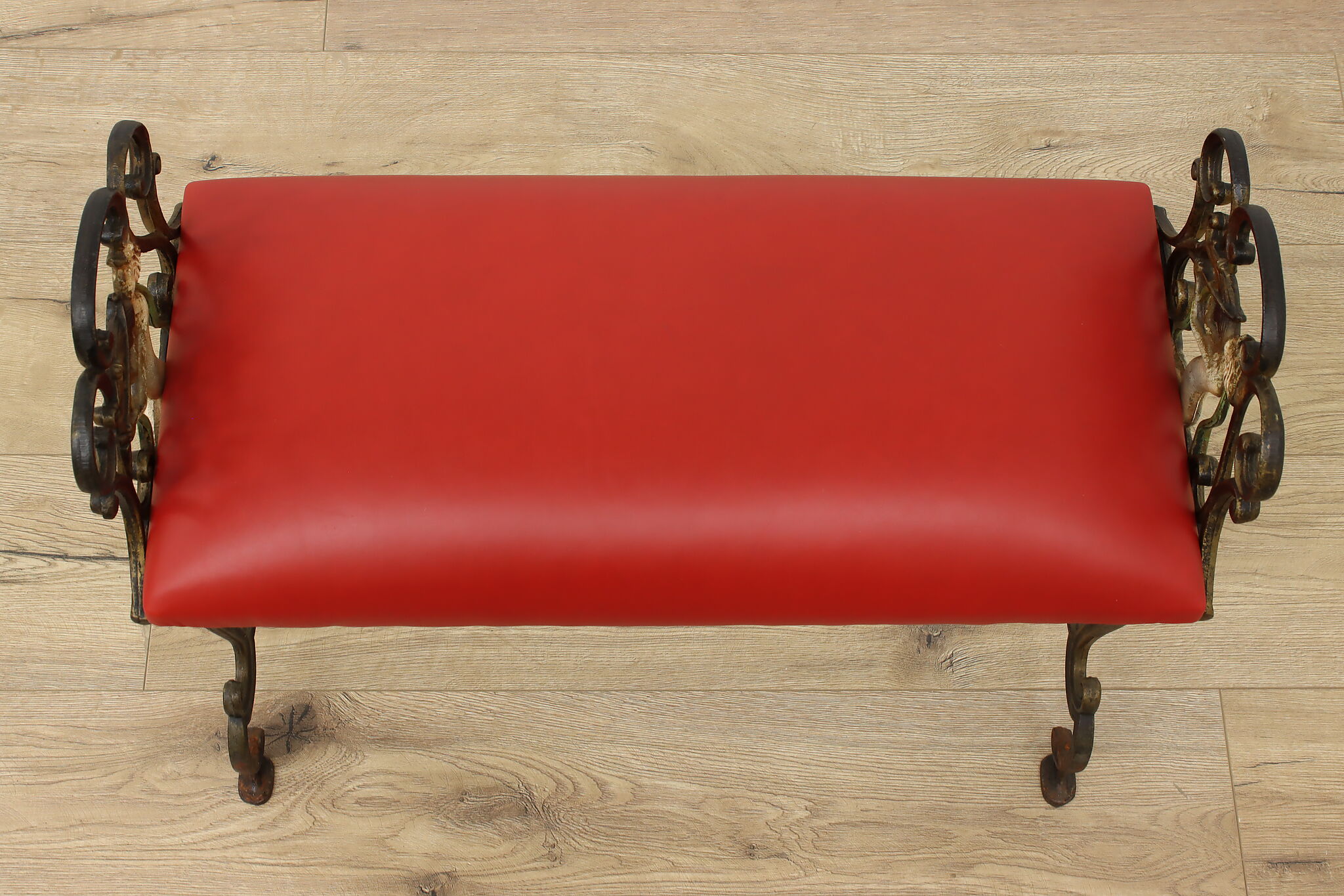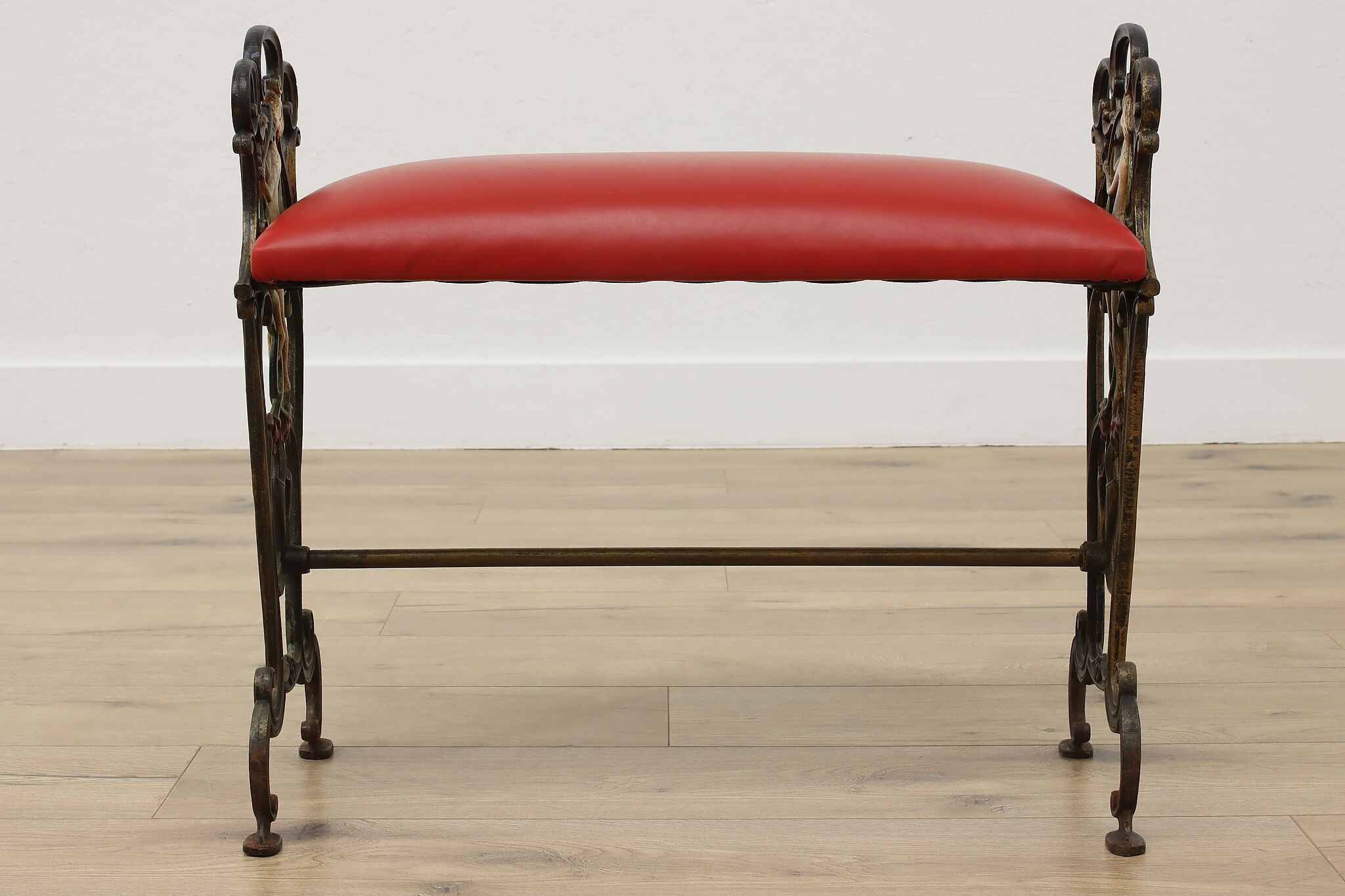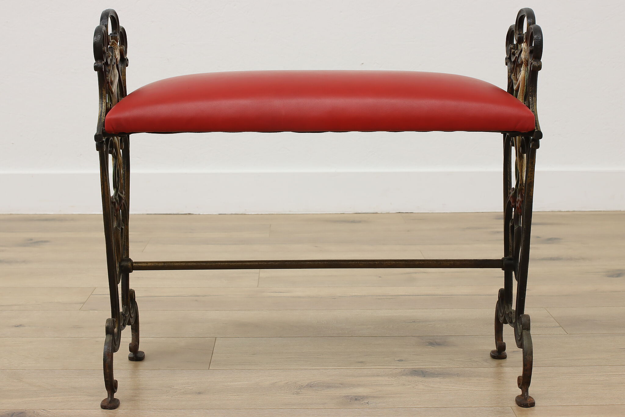 Add some charming seating to your hall or boudoir with this bench and its motifs of a musician playing a violin plus new red leather upholstery.