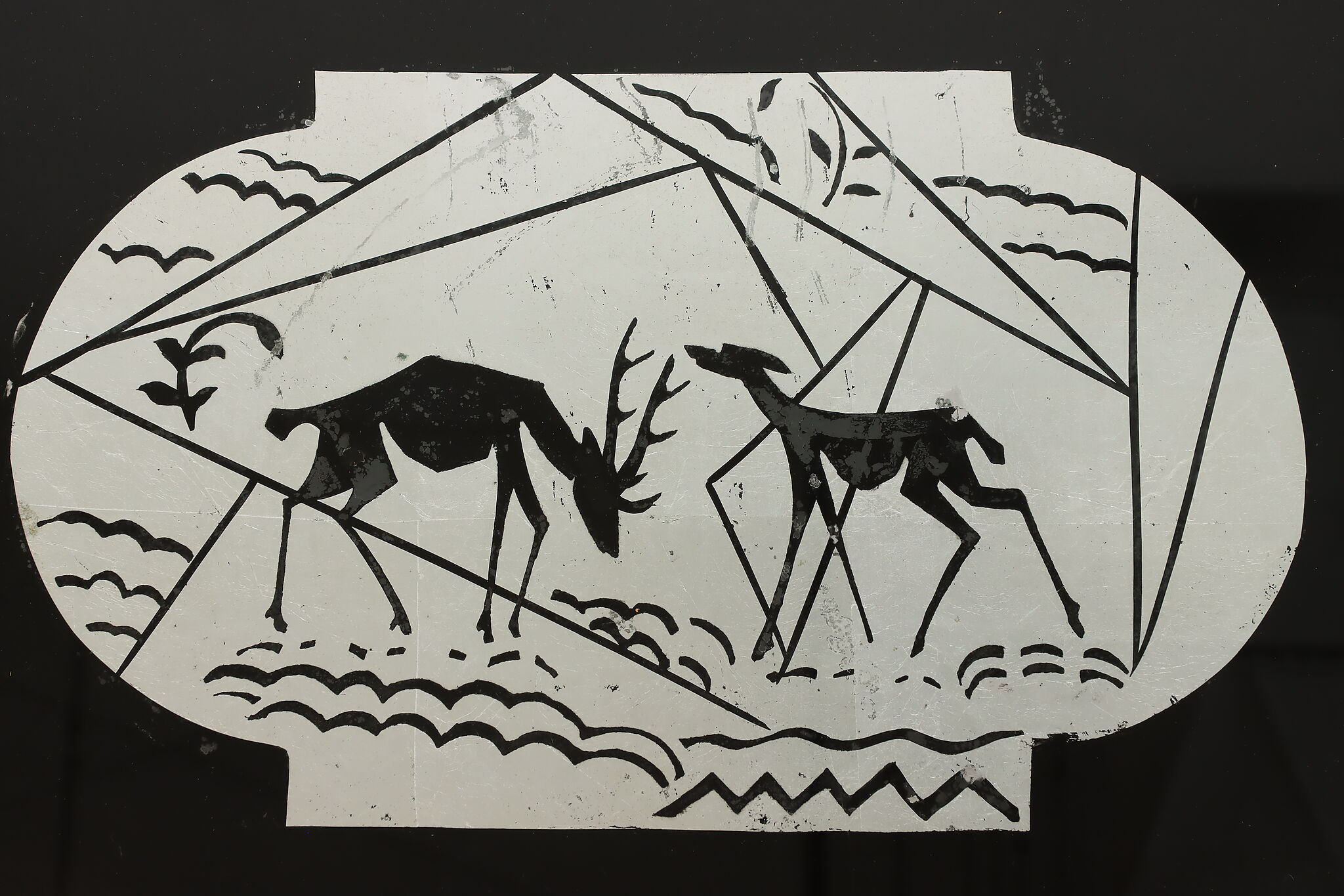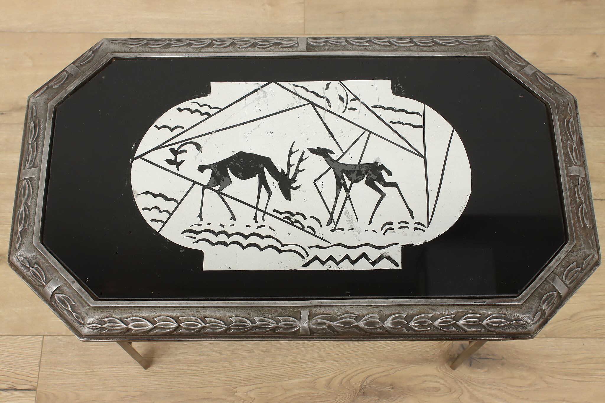 Beautifully crafted during the Art Deco period, this side or end table has a lovely hand-painted scene of a buck and doe.