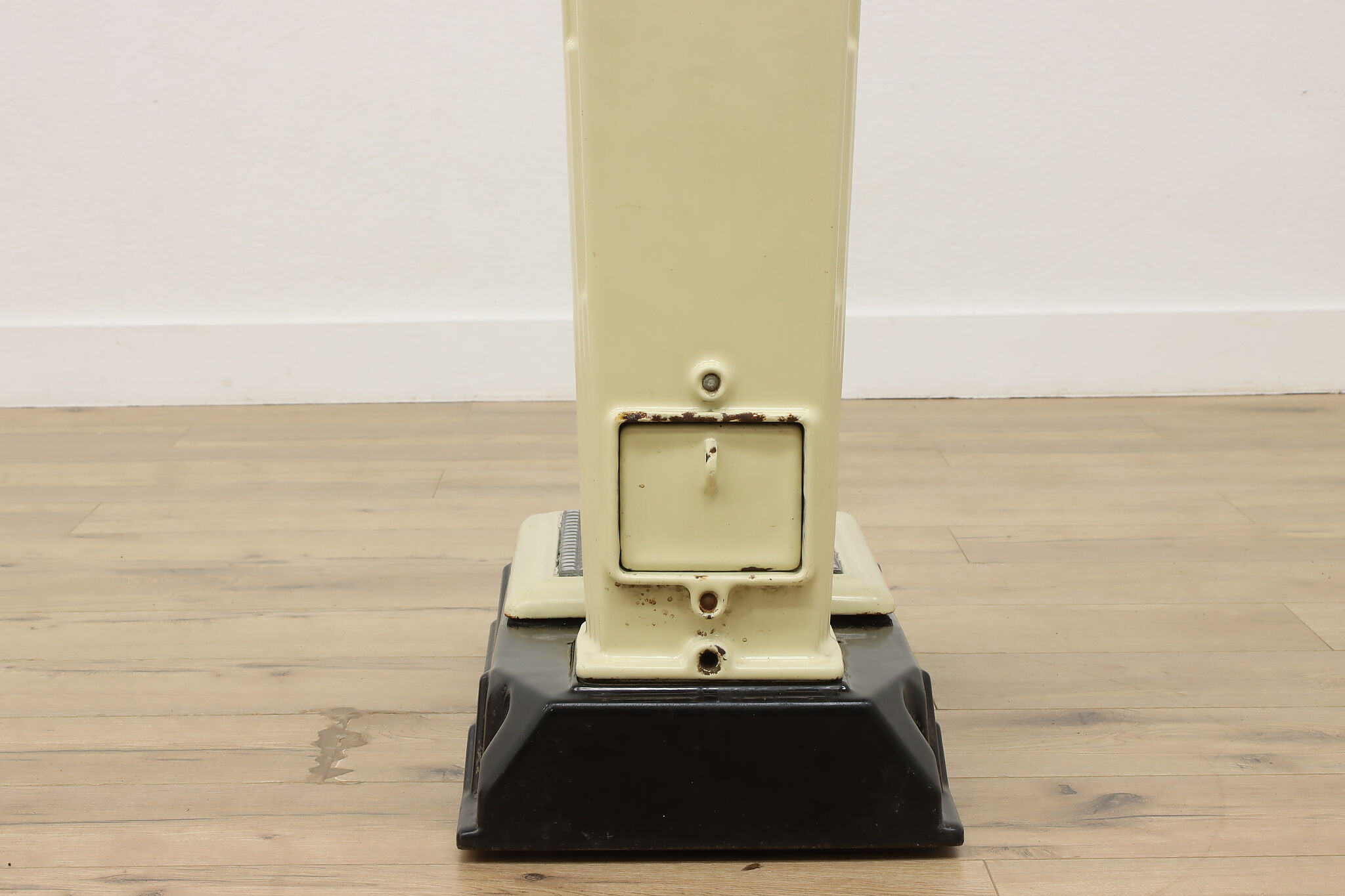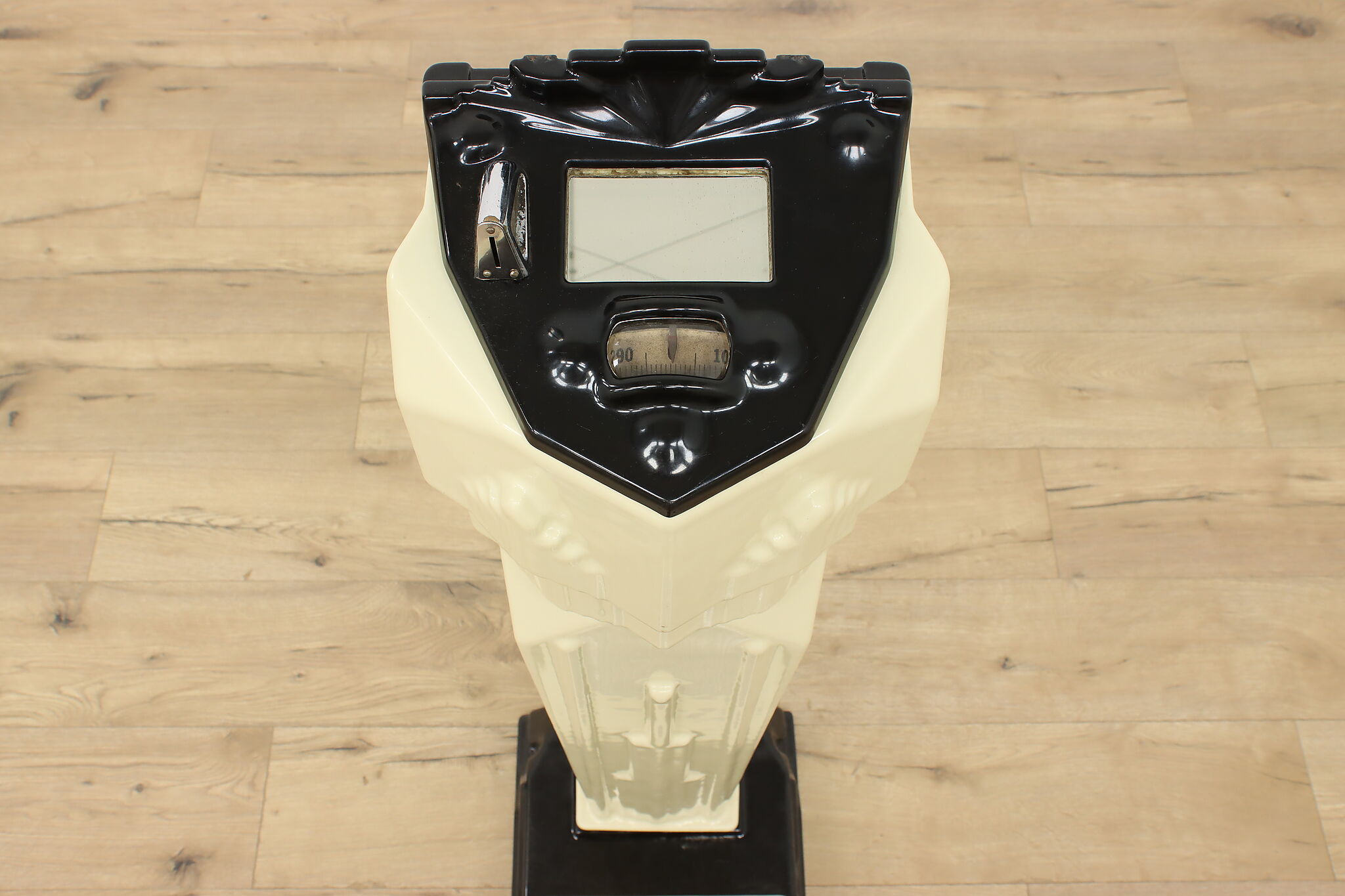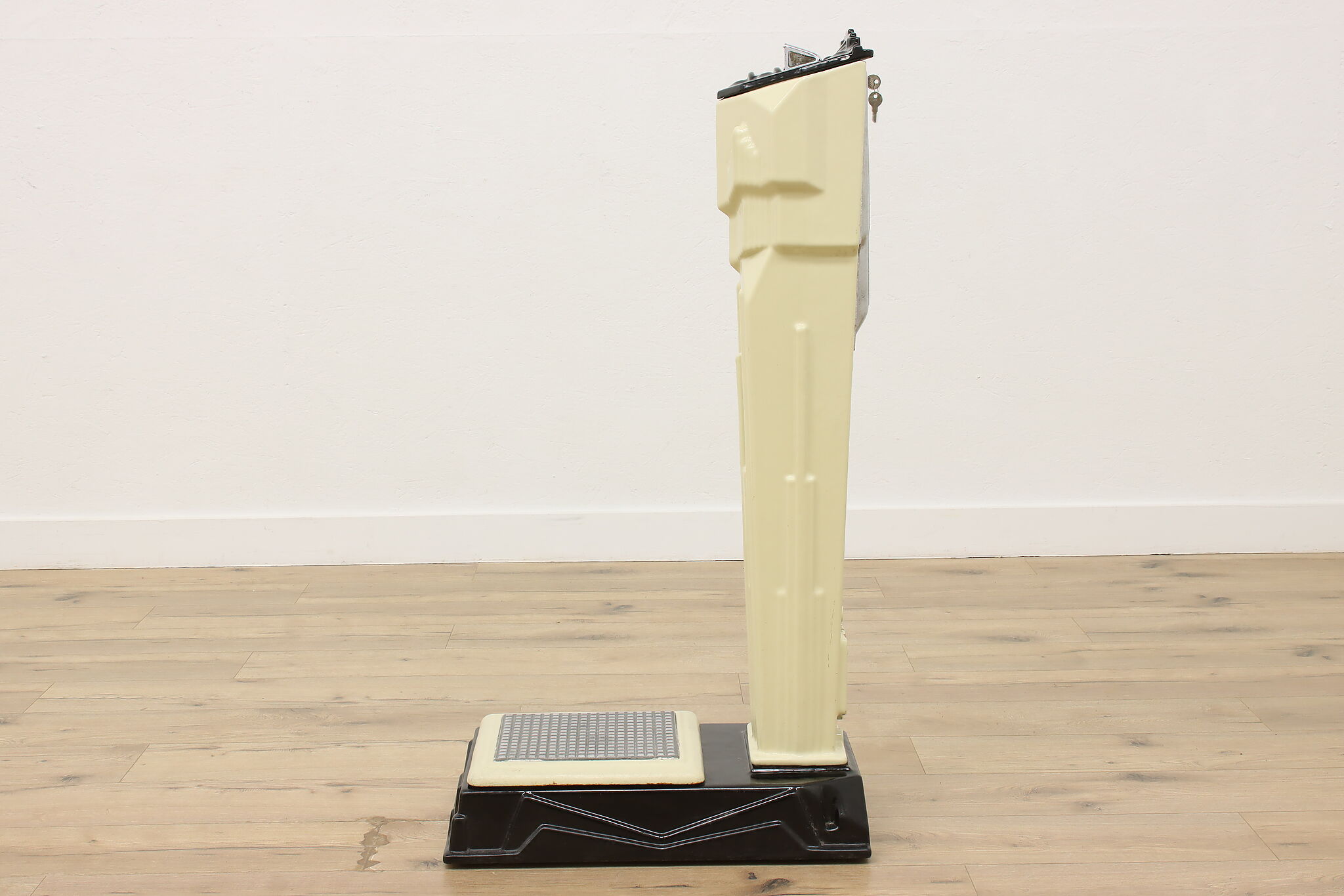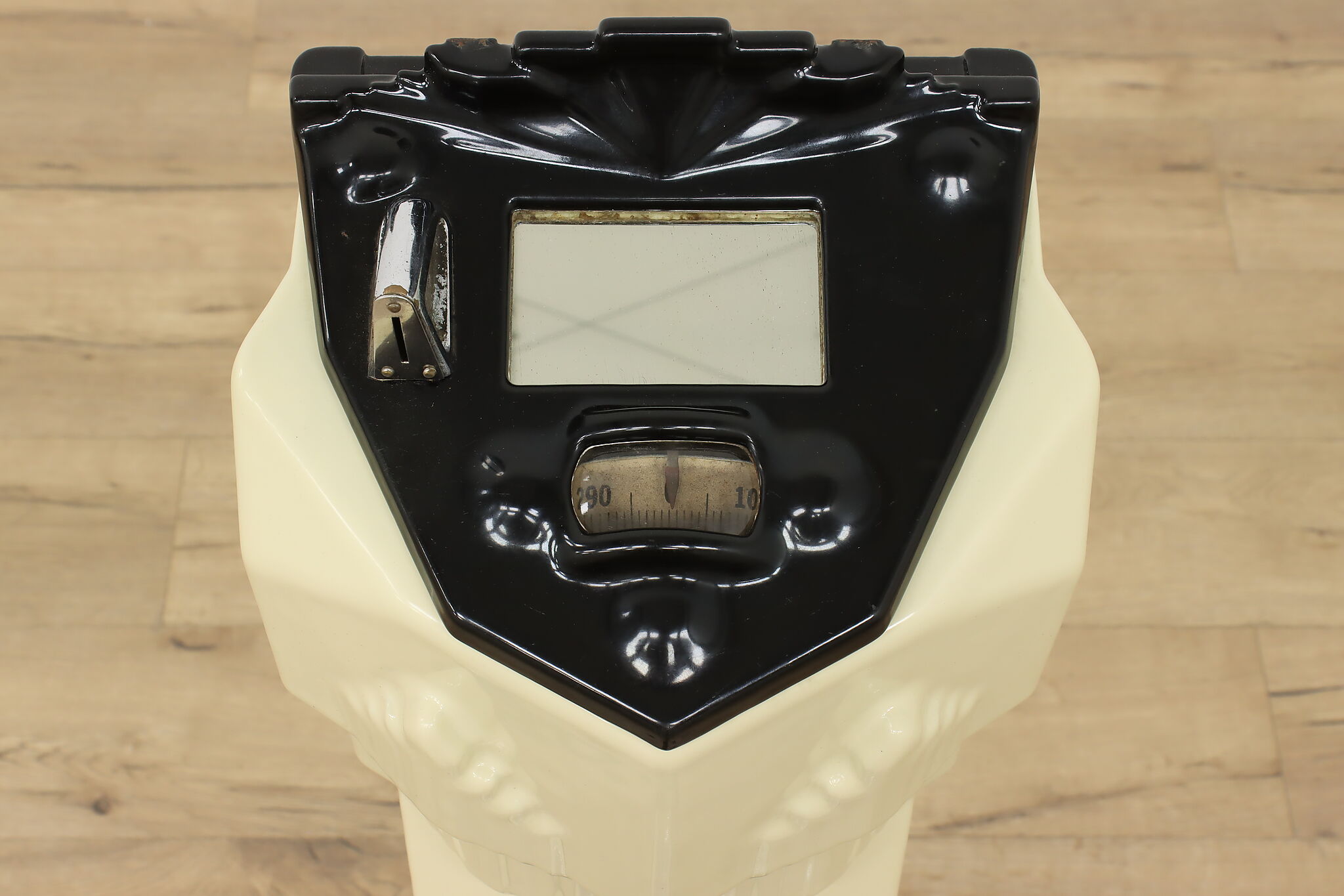 An Art Deco era coin-operated floor scale would've been found in amusement parks and outside of grocery stores for entertainment. Simply pop pennies into the coin deposit until your weight is reached!
