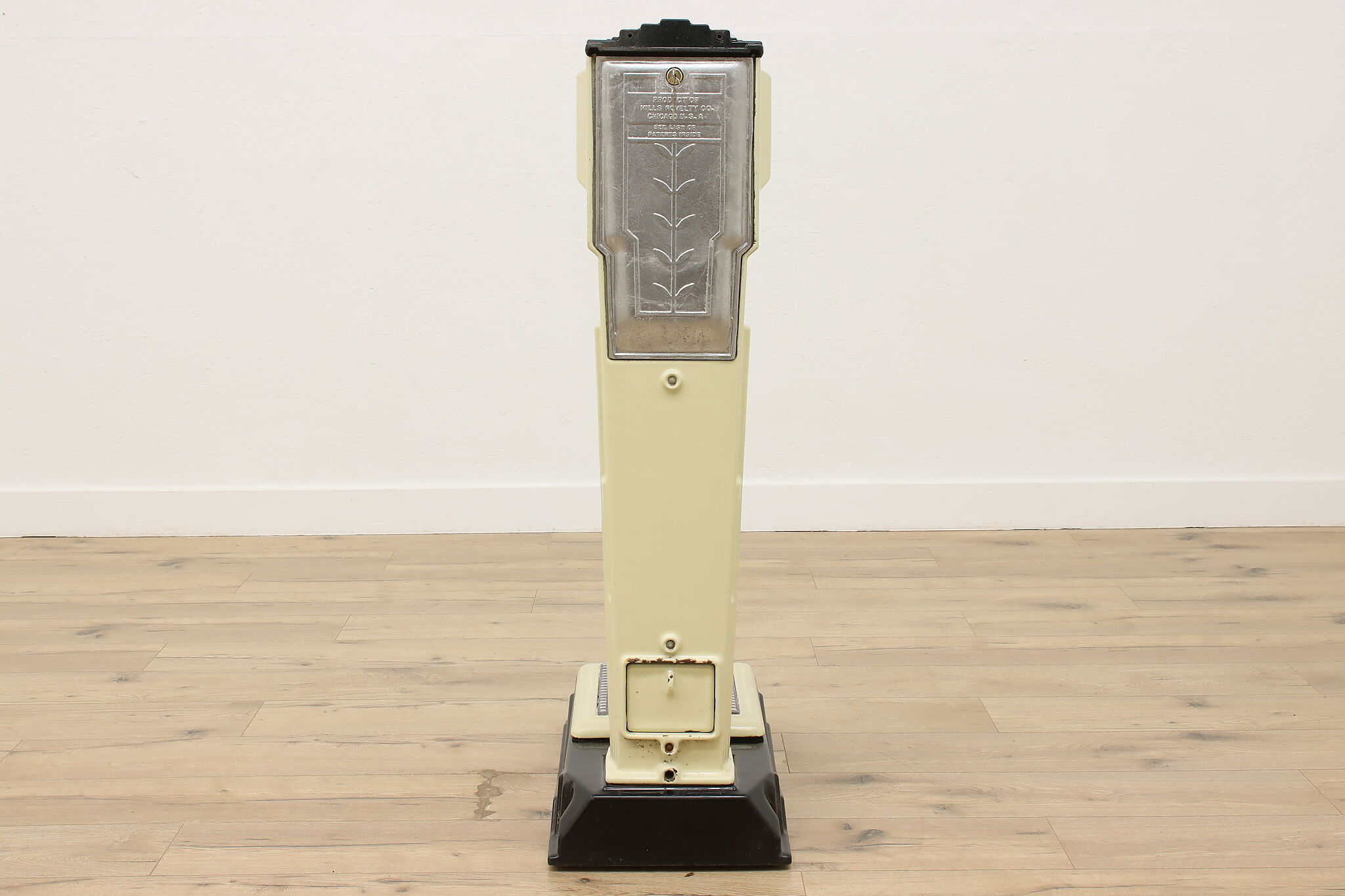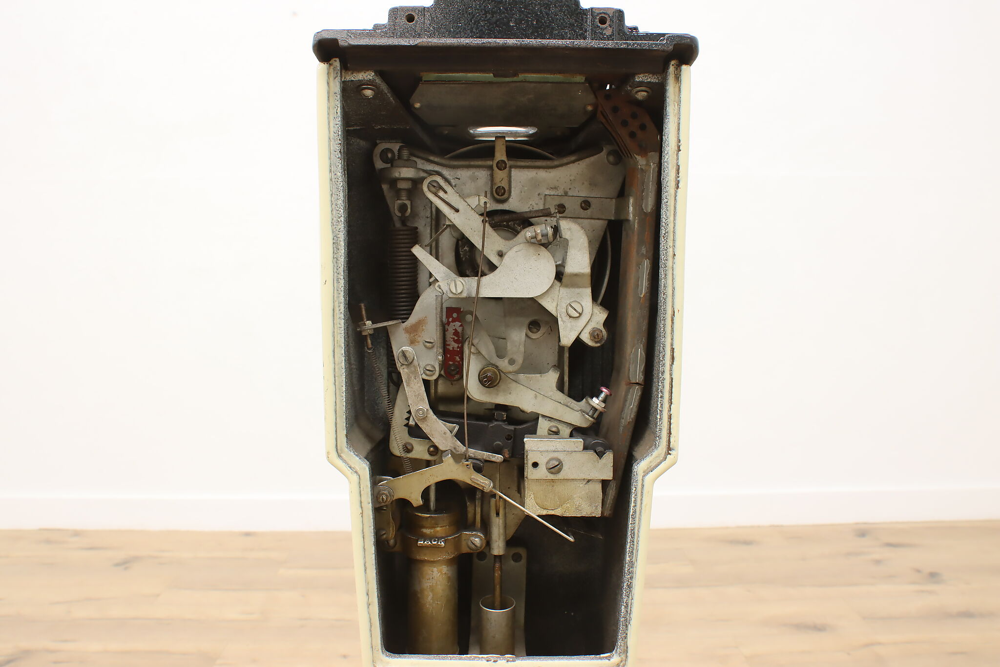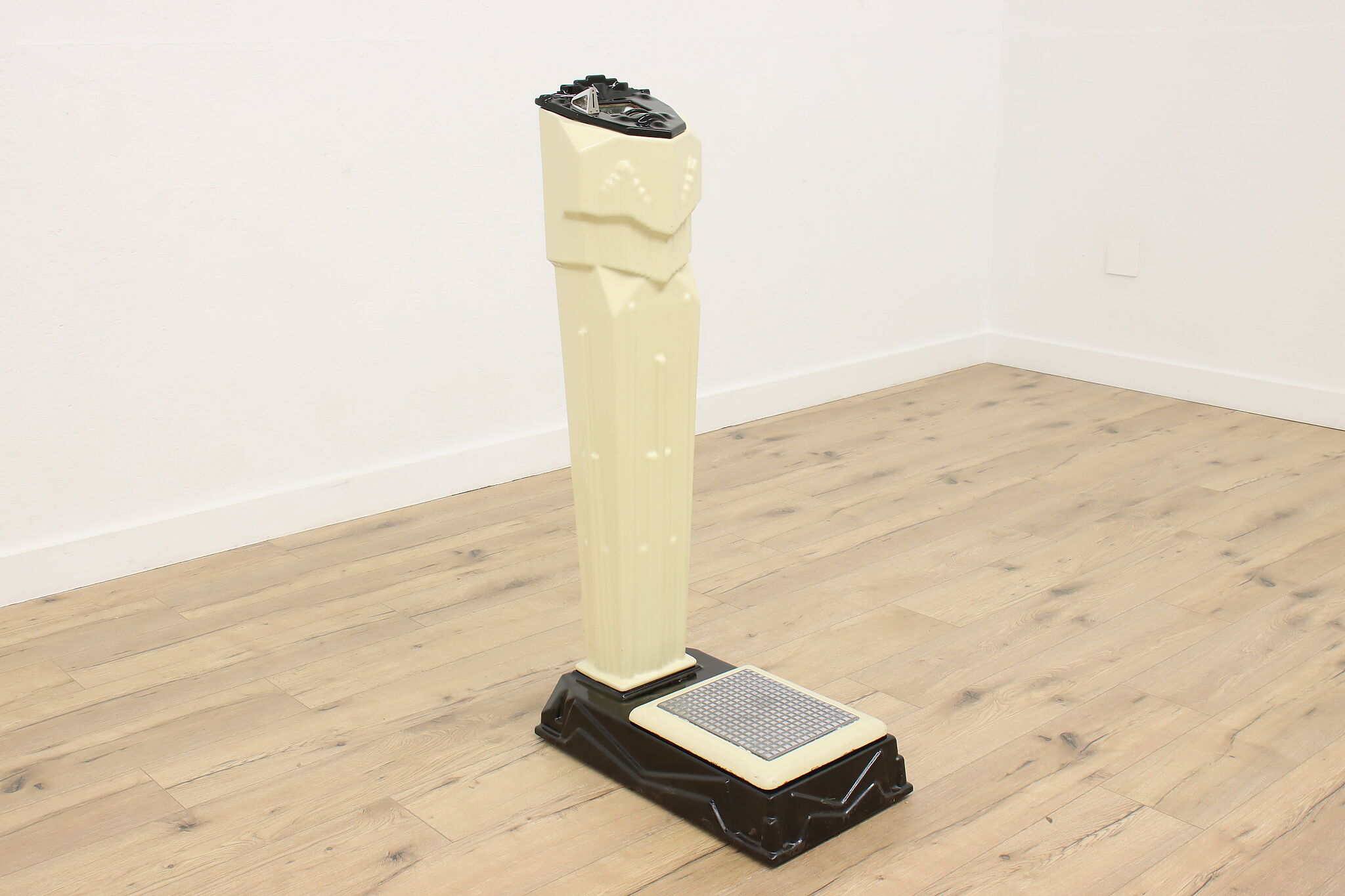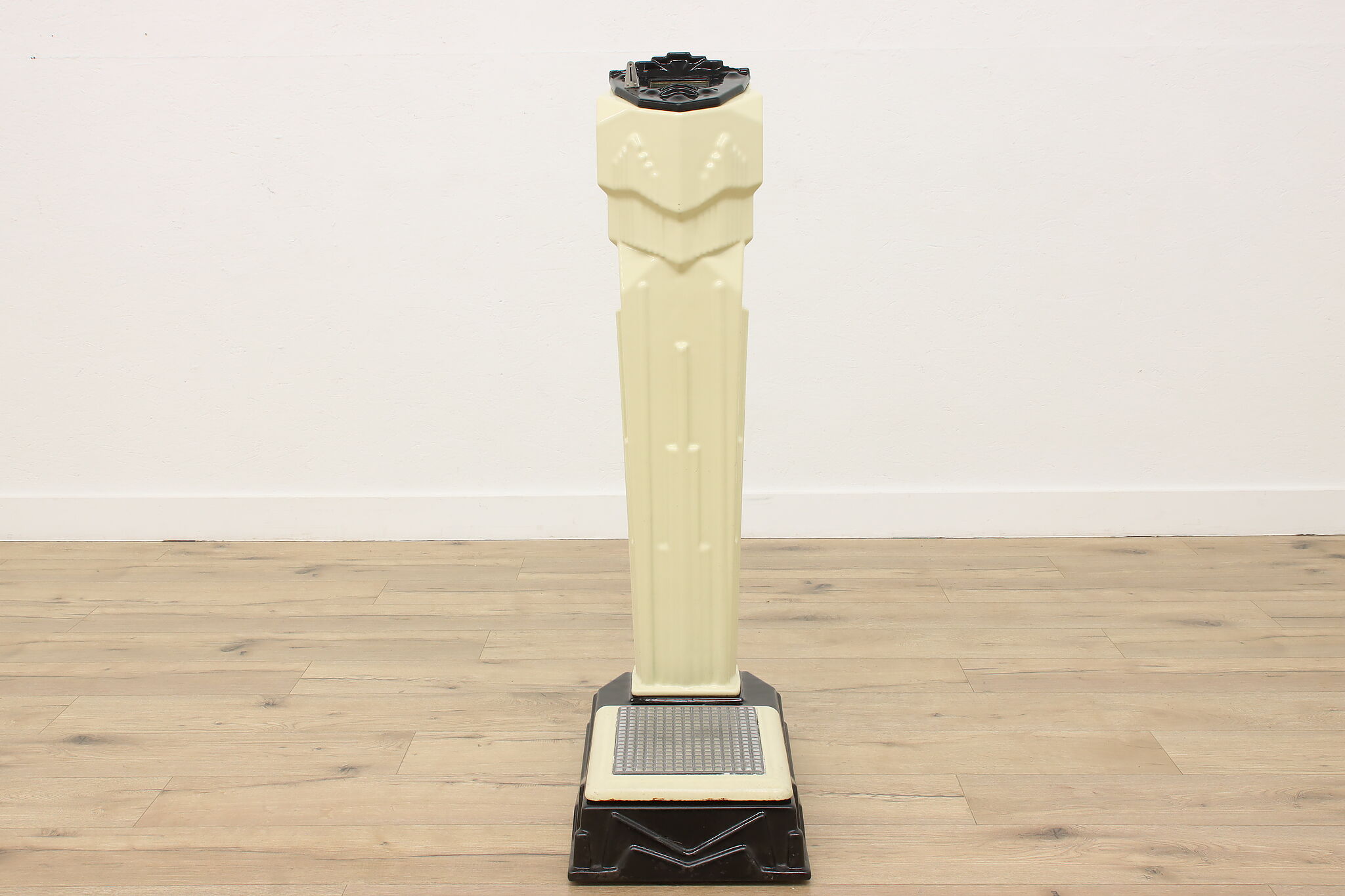 An Art Deco era coin-operated floor scale would've been found in amusement parks and outside of grocery stores for entertainment. Simply pop pennies into the coin deposit until your weight is reached!