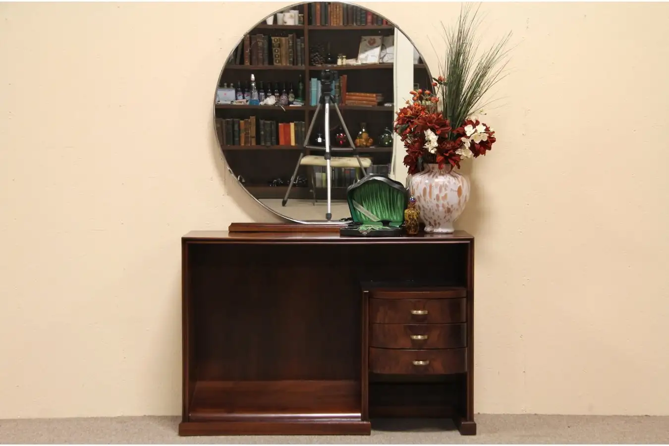 This magnificent authentic Art Deco vanity or dressing table and mirror would make a nice hall console or even a bar.