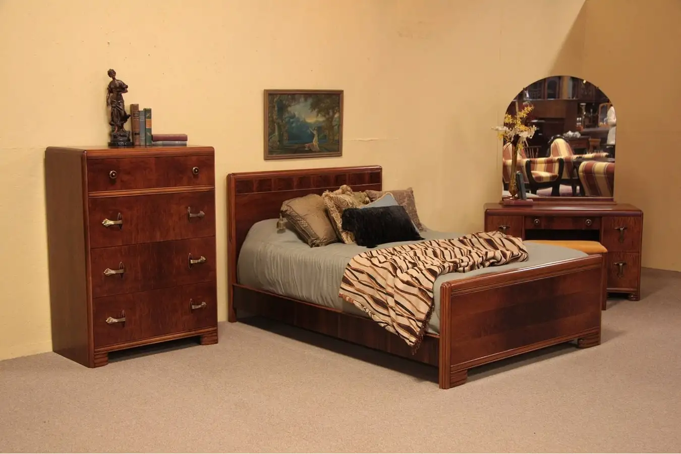 Sleek lines and beautifully figured wood are exceptional on this 3 piece Art Deco bedroom set. The set includes a tall chest of drawers, dressing table or vanity with arched mirror and bench, and a standard full or double size bed.