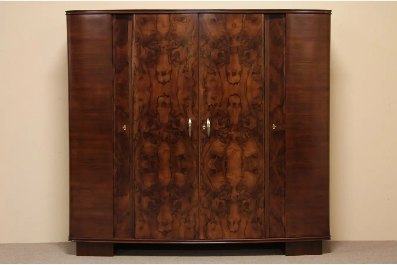This magnificent authentic Art Deco armoire was carved in Italy about 1925. The matched walnut "oyster" burl is beautiful.